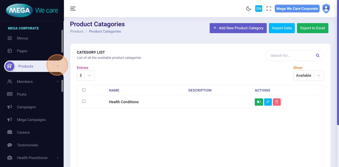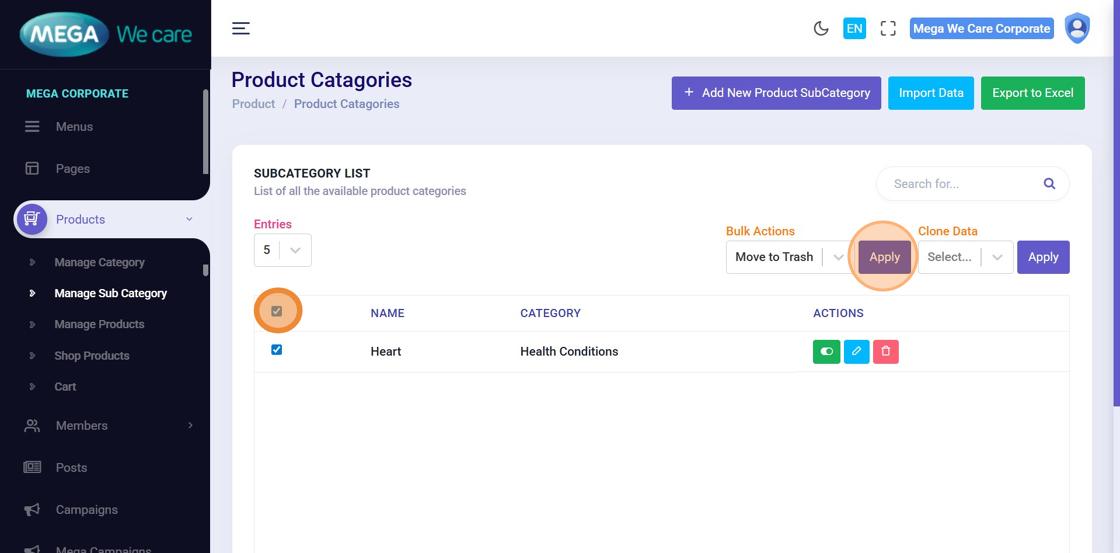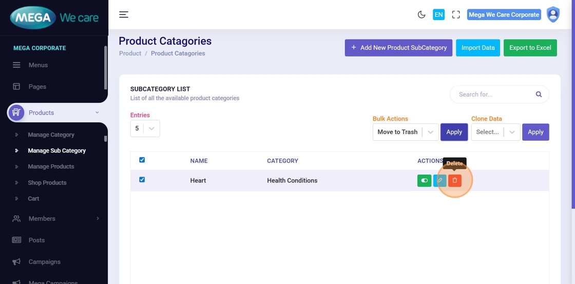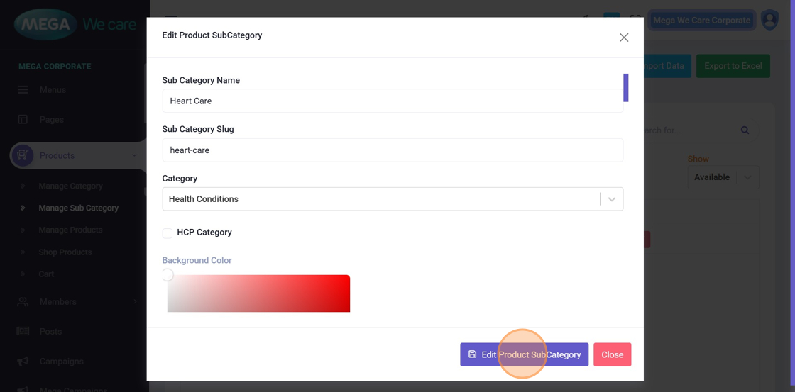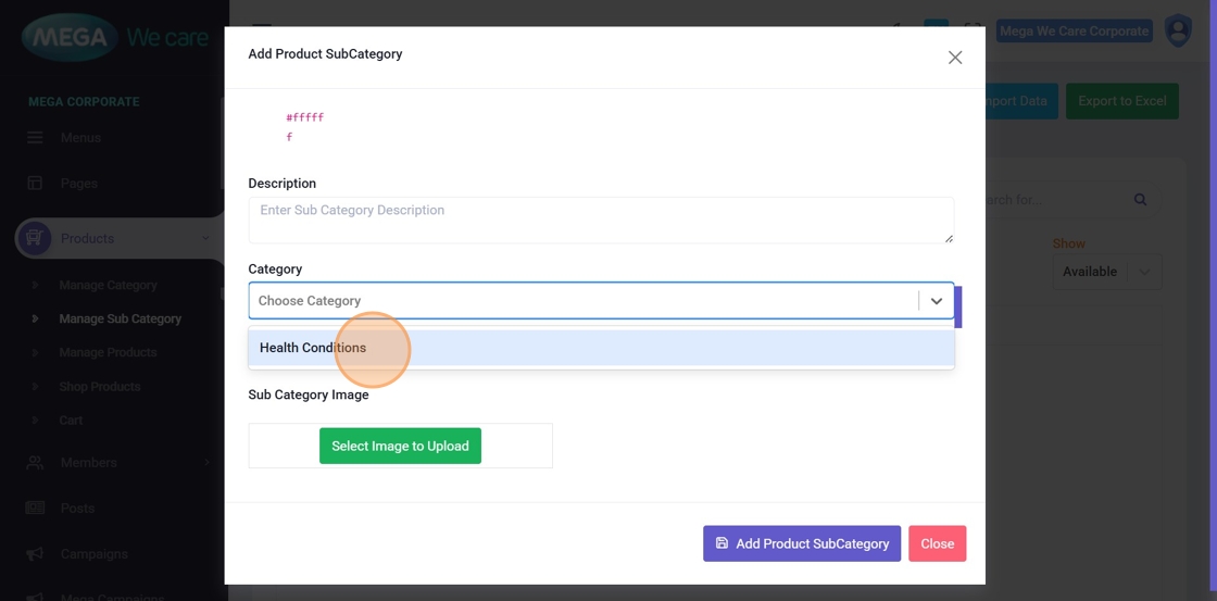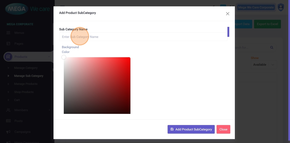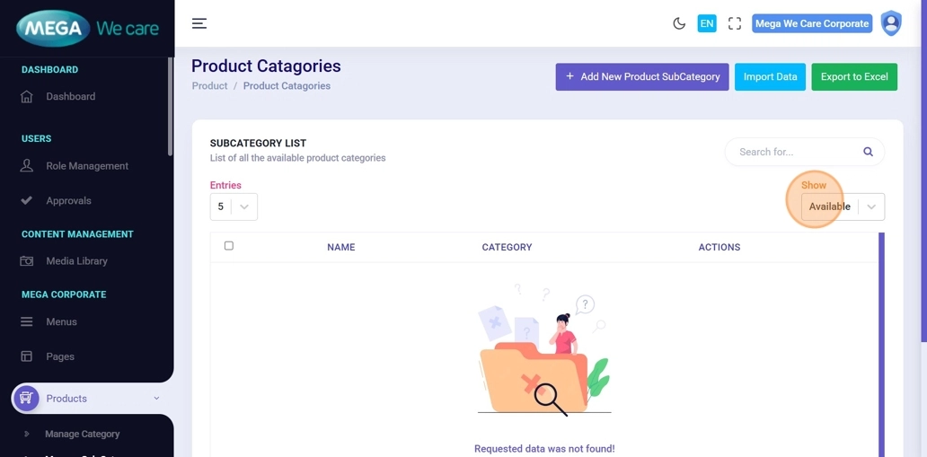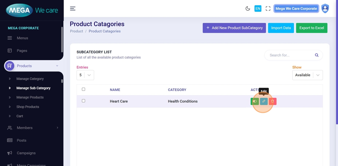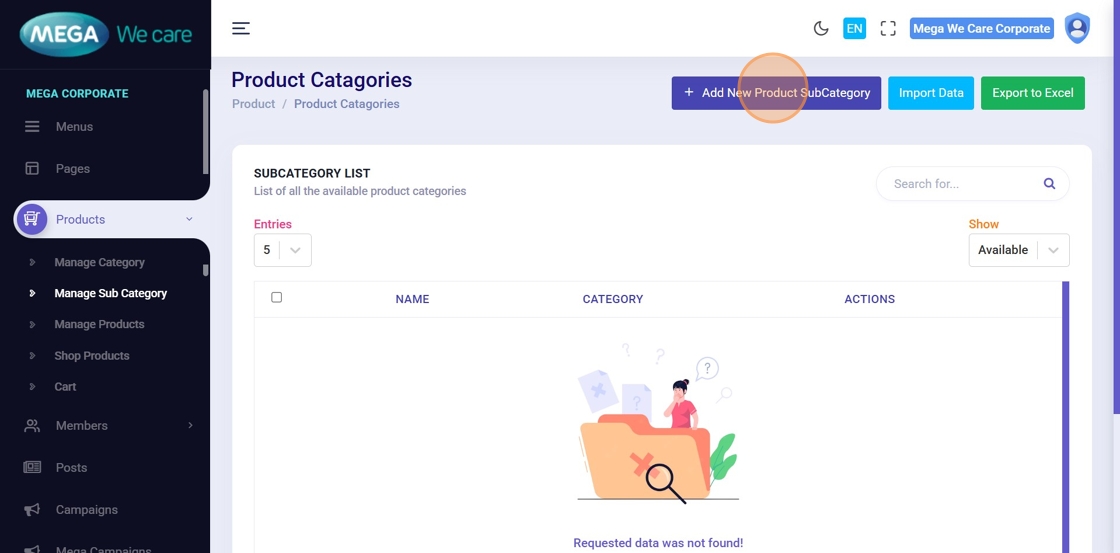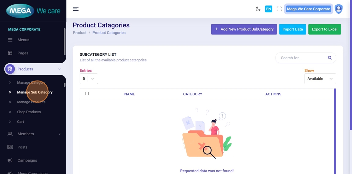 Under the Products menu, click Manage Sub Category. This opens the Product Subcategory listing page.