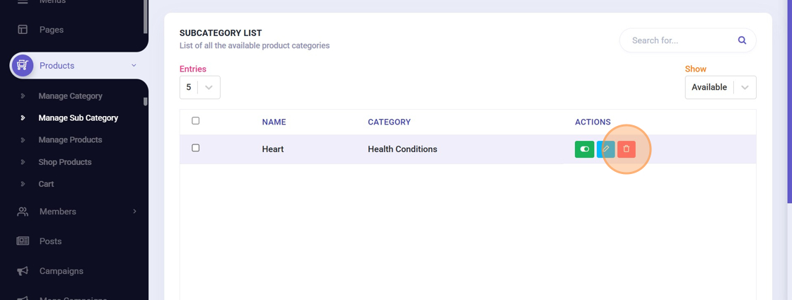 Change the status dropdown from Available to Trash to view all deleted subcategories. From here, you can restore or permanently delete items.