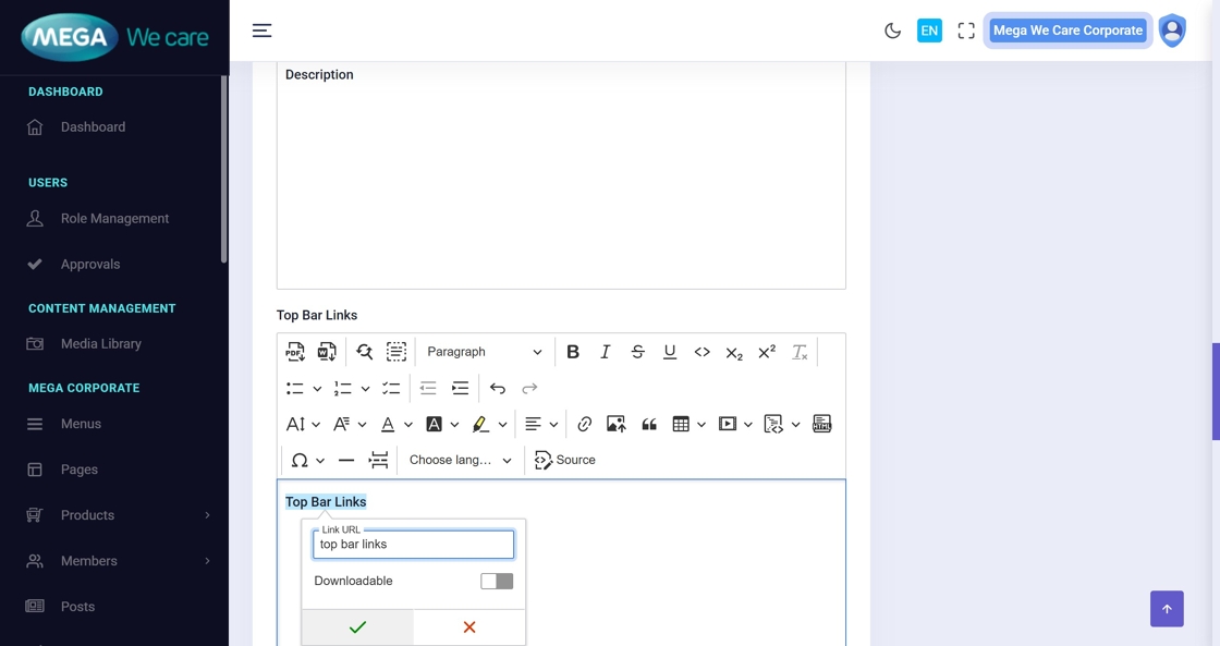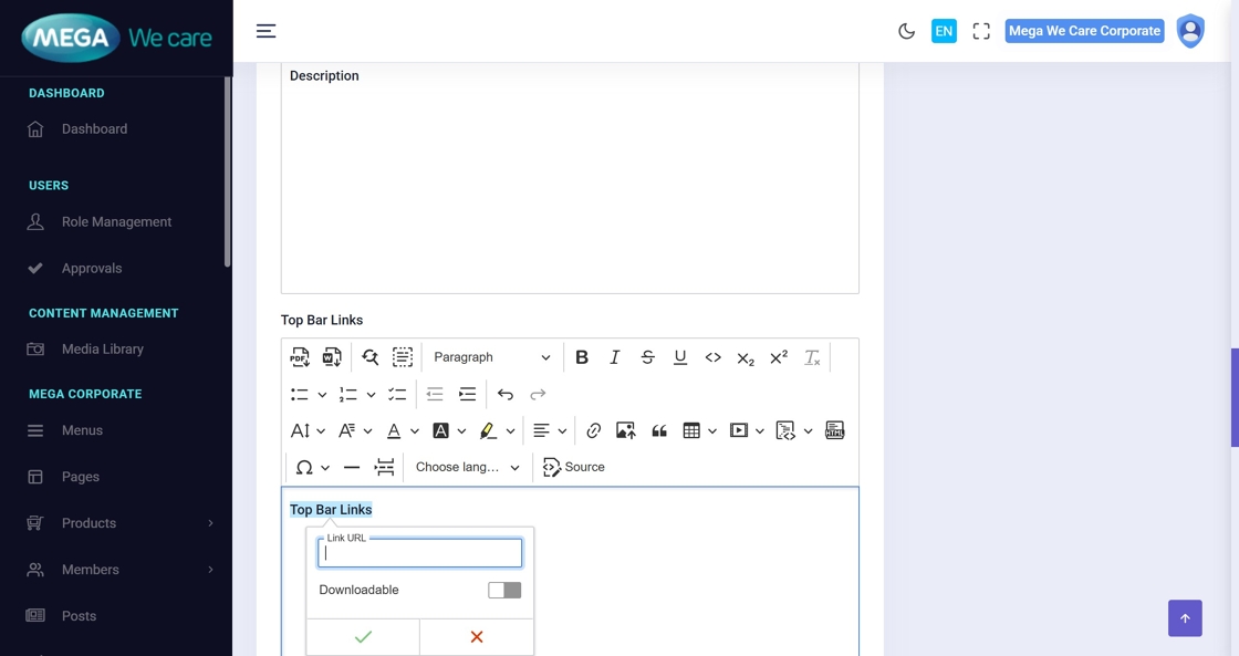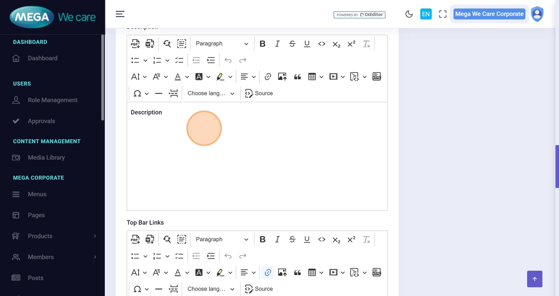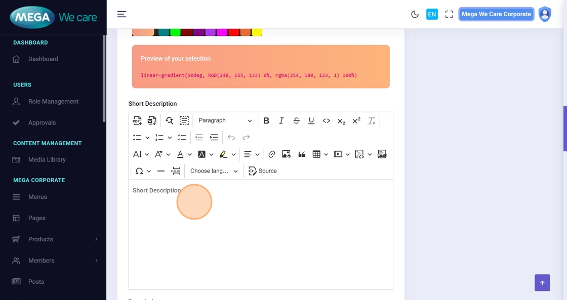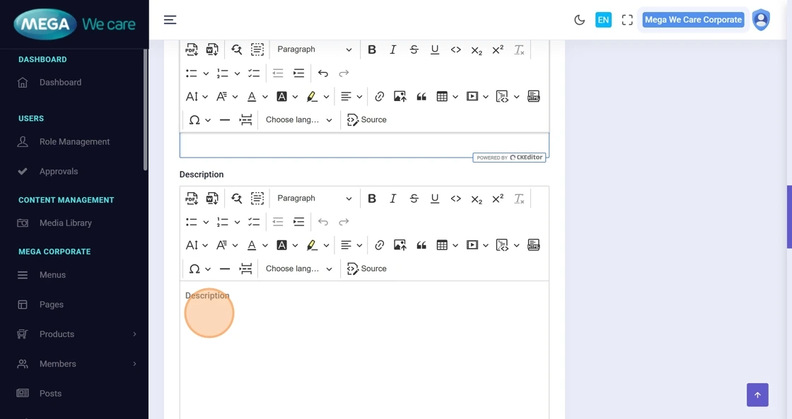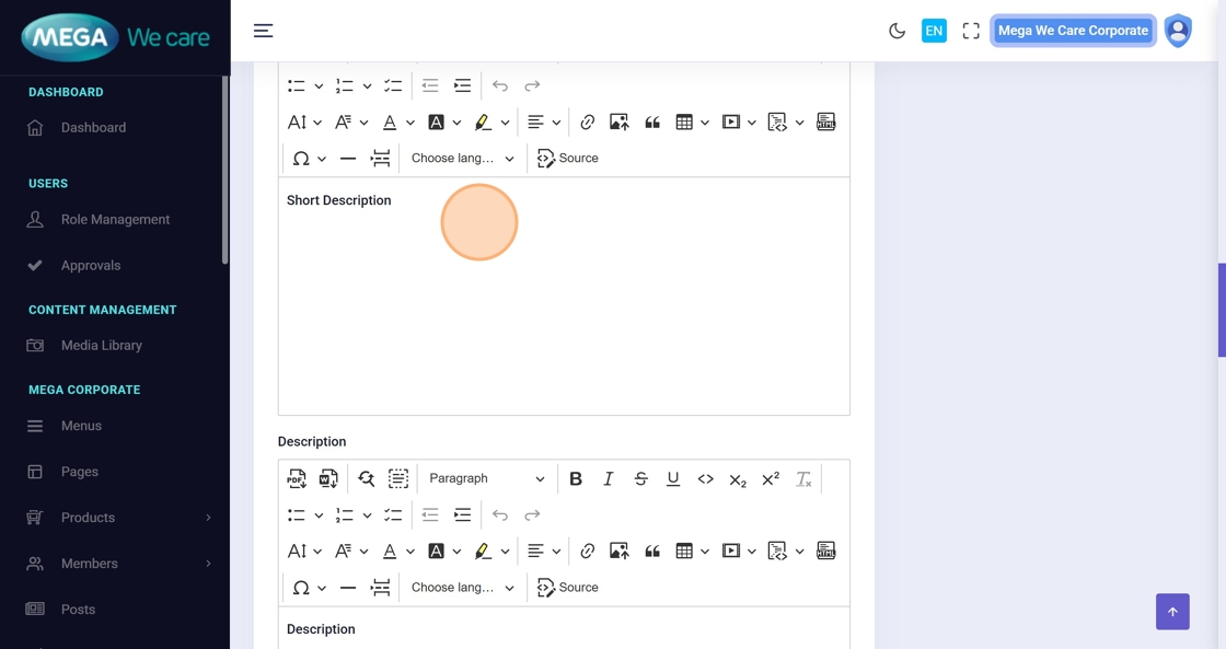 Enter the Short Description, then the main Description, and continue adding additional content as needed.