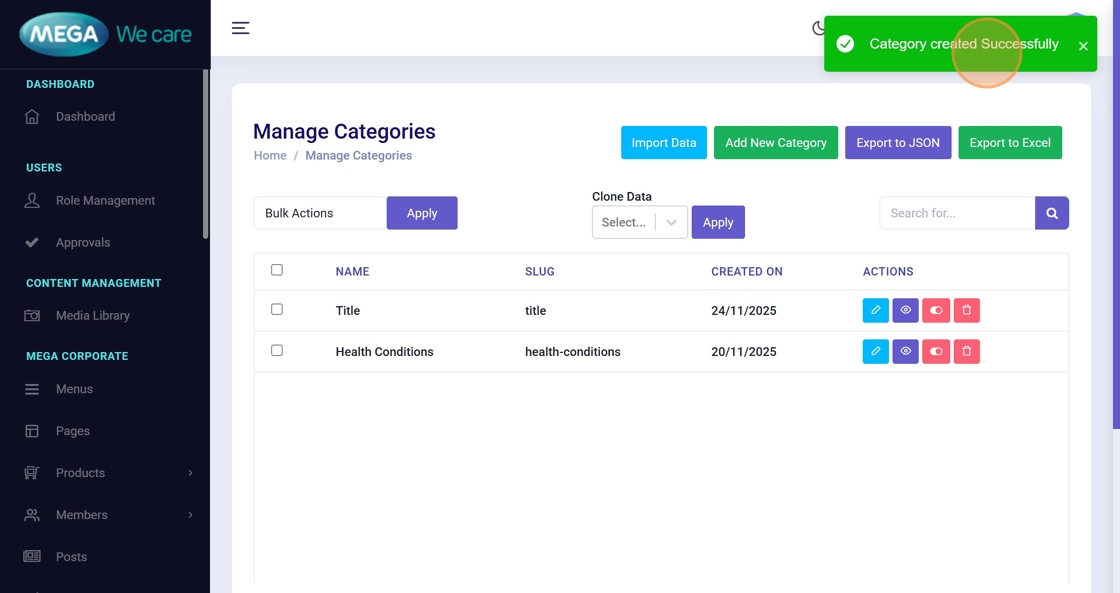 A message “Category created Successfully” confirms successful creation.