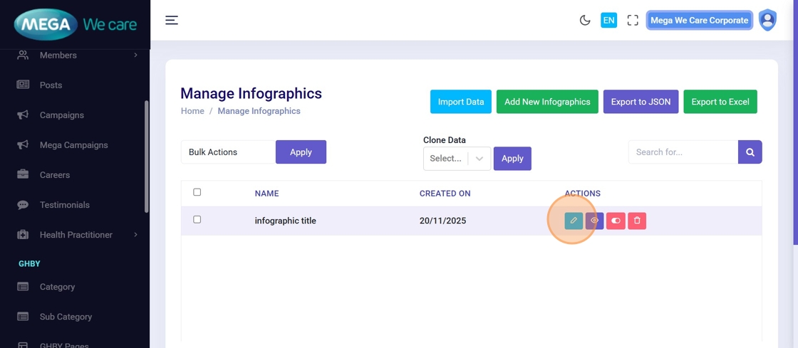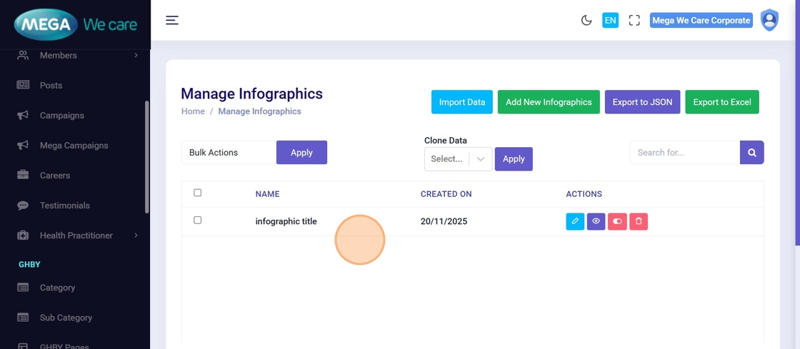 This document explains how the Infographics module enables administrators to efficiently manage GHBY visual content. Using this module, users can create, edit, publish or unpublish, organize, and delete infographics, upload single or multiple images, manage image order, and control publishing details.
