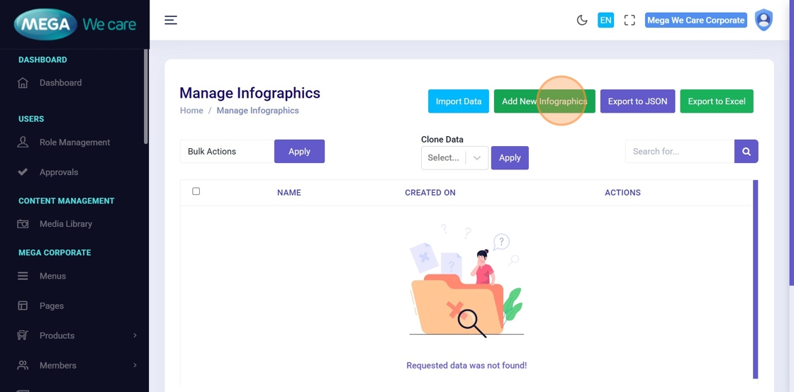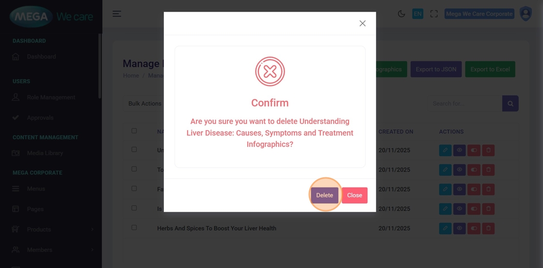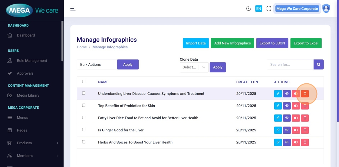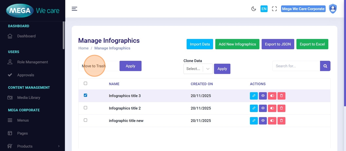 Select one or more infographics → choose Move to Trash from Bulk Actions → click Apply.