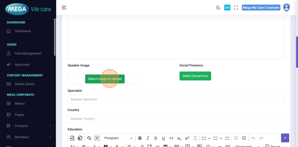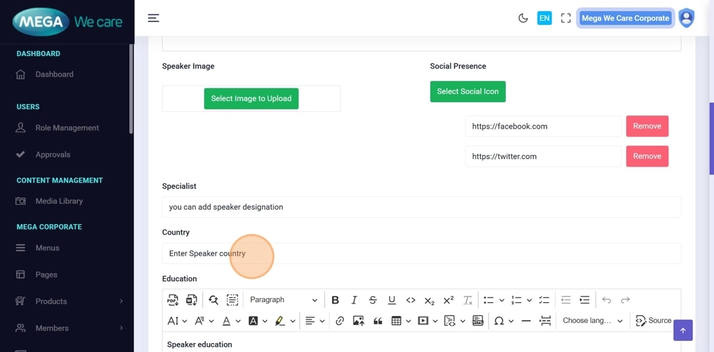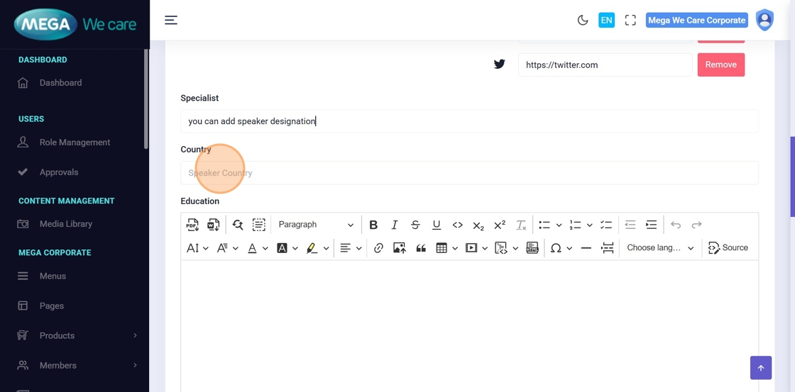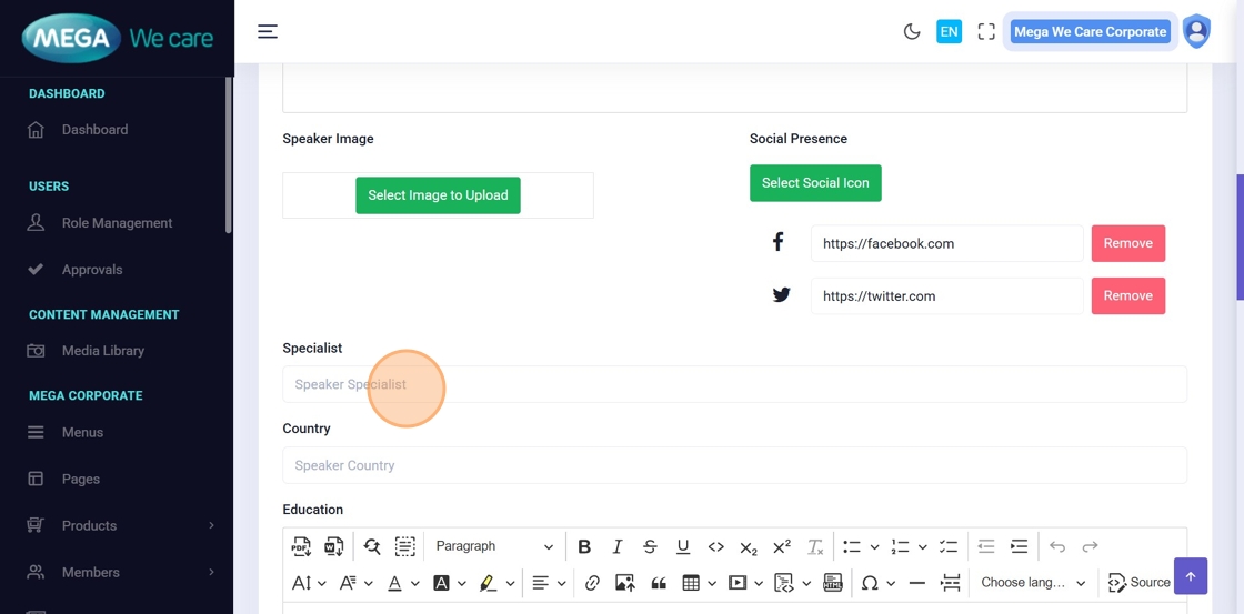 Enter the speaker’s professional designation in the Specialist field (for example, MD, MBBS).