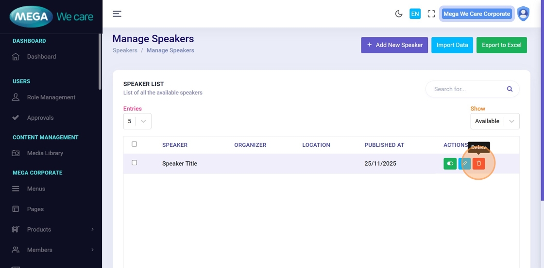 By using the HCP Speakers module, administrators can create and manage professional speaker profiles with biographies, images, social links, and SEO details, update information as needed, and permanently remove outdated profiles. This ensures accurate, consistent, and search-optimized representation of HCP speakers across the platform.