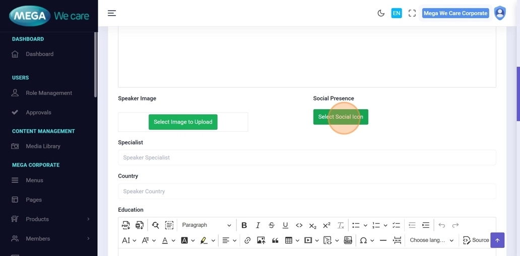The HCP Speakers module enables administrators to create and manage professional Health Care Practitioner (HCP) speaker profiles. This includes adding speaker details, biographies, images, social media links, qualifications, and SEO metadata to ensure speakers are accurately represented and optimized for search visibility.
