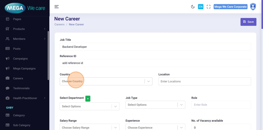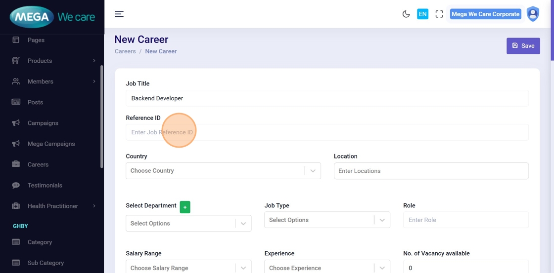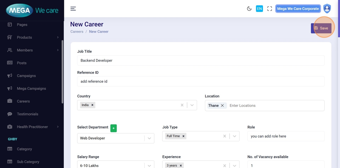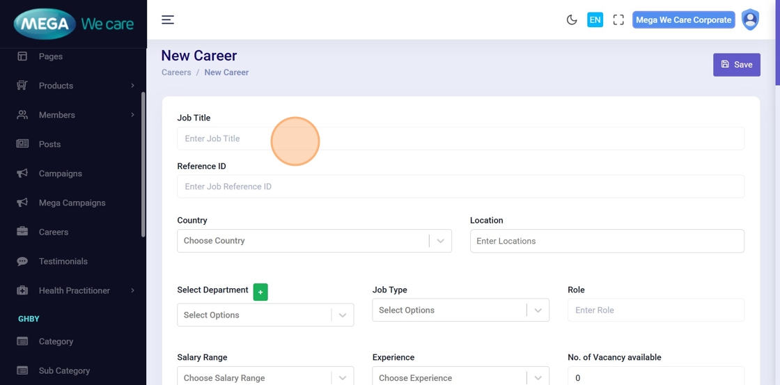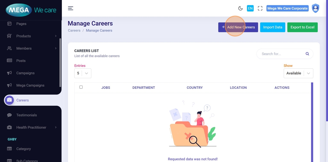 On the Manage Careers page, click Add New Careers to create a new job posting.