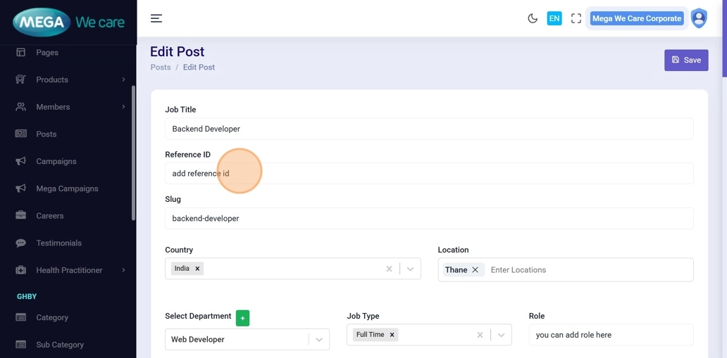 Modify any job details (reference ID, description, location, etc.), then click Save.