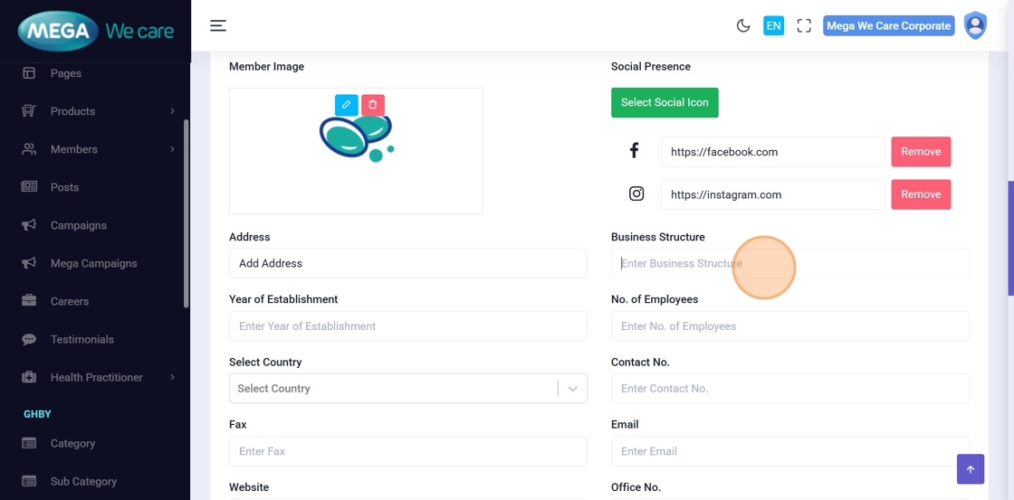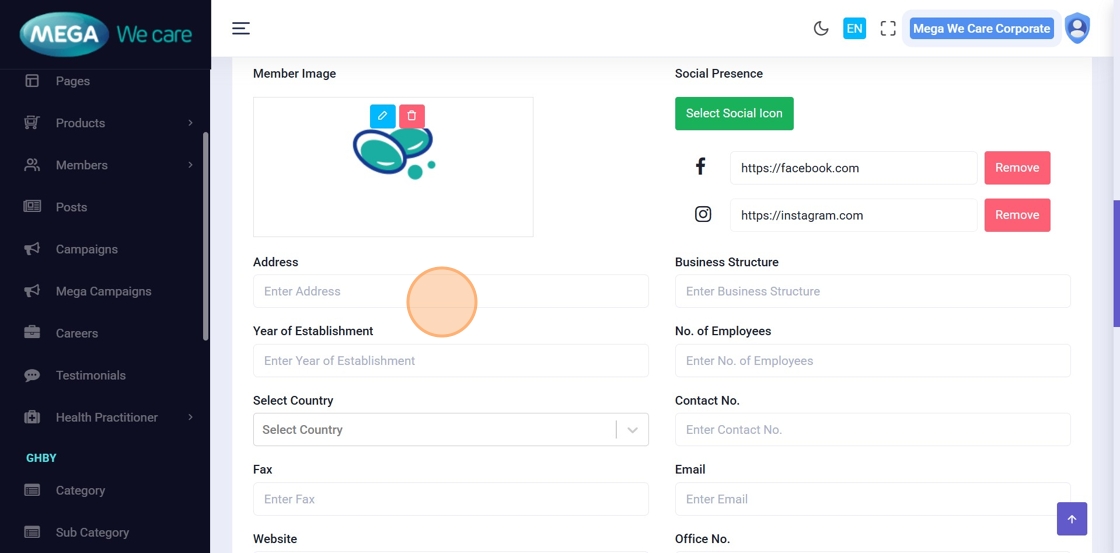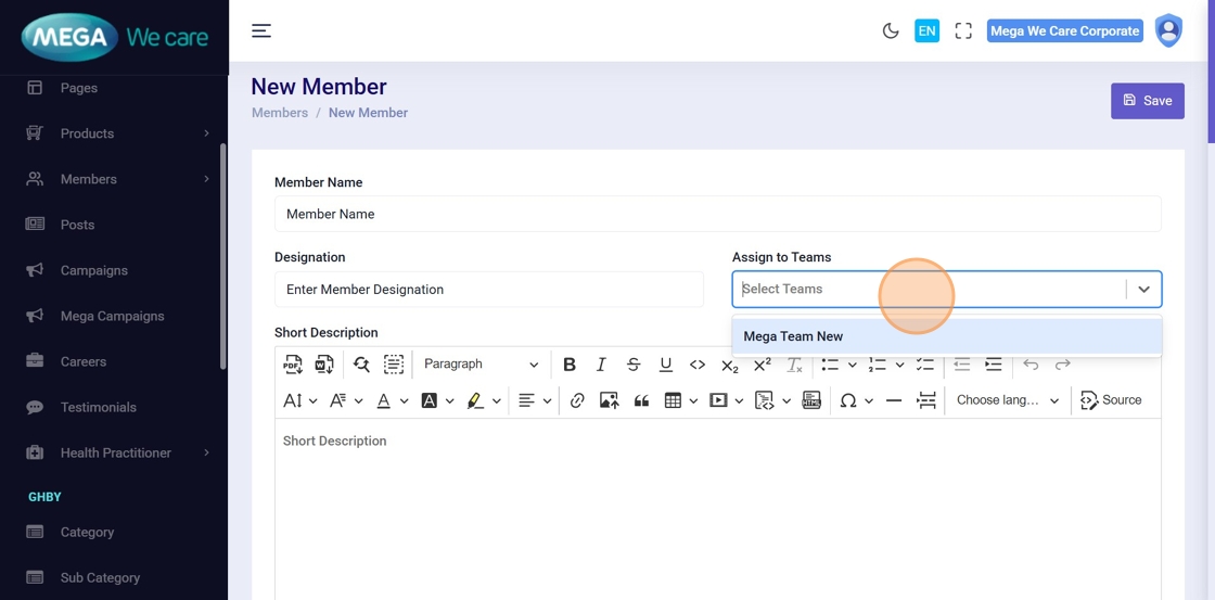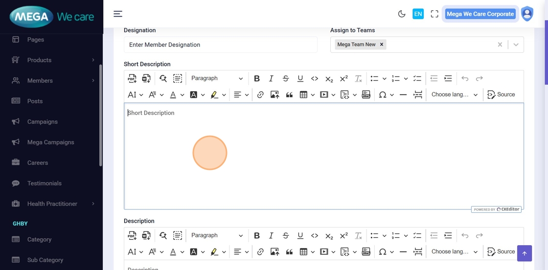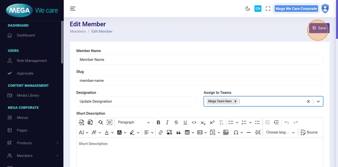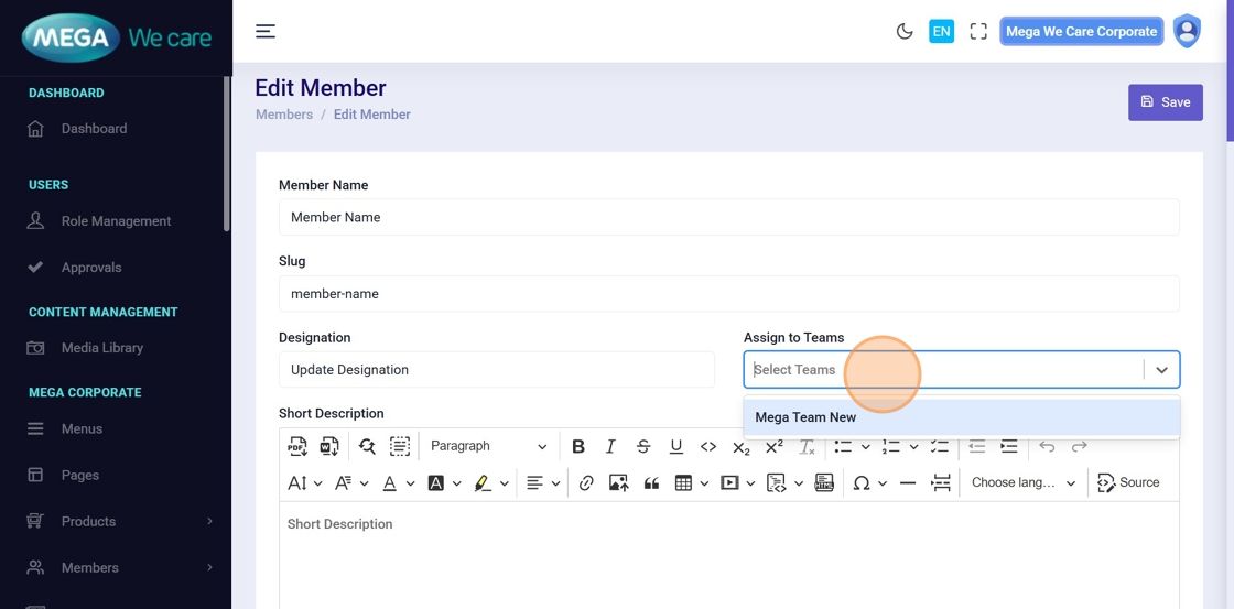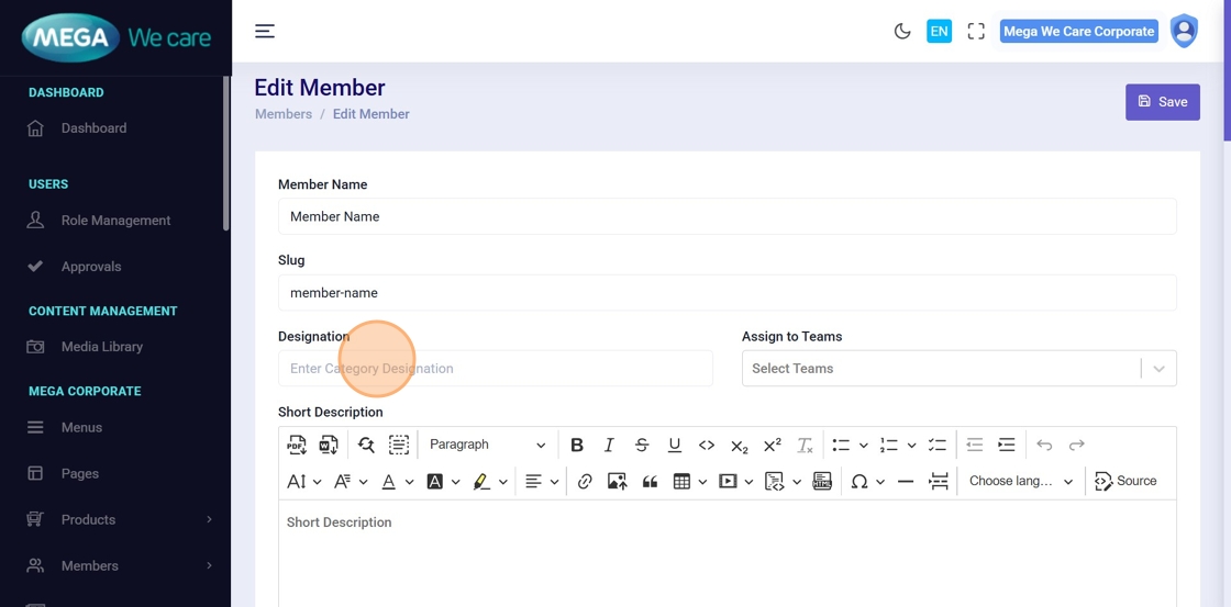 This document explains how users can manage Mega Directors and Country Manager profiles using the Members module. It covers adding and updating profiles, assigning teams, uploading images, managing social links and career details, handling SEO information, and safely deleting profiles when needed.