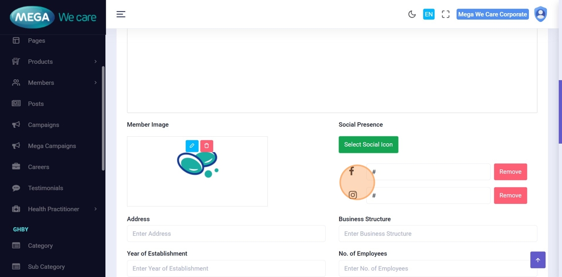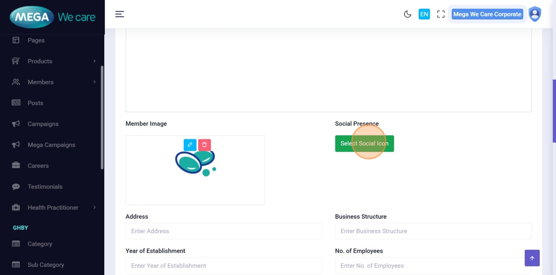 Click Select Social Icon to choose platforms (e.g., Facebook, Instagram, LinkedIn).