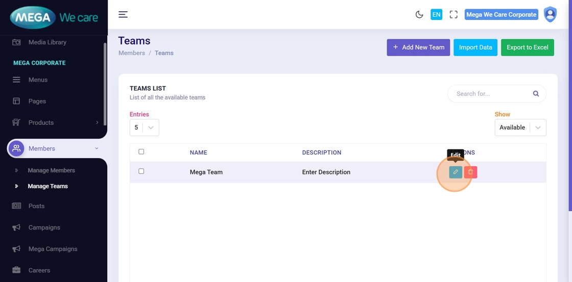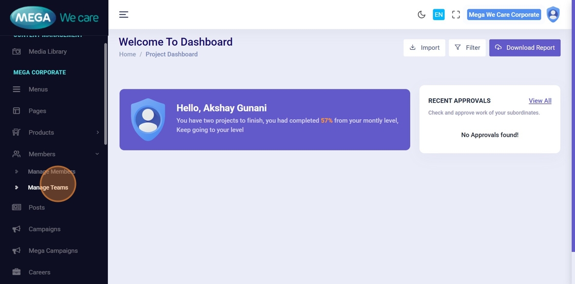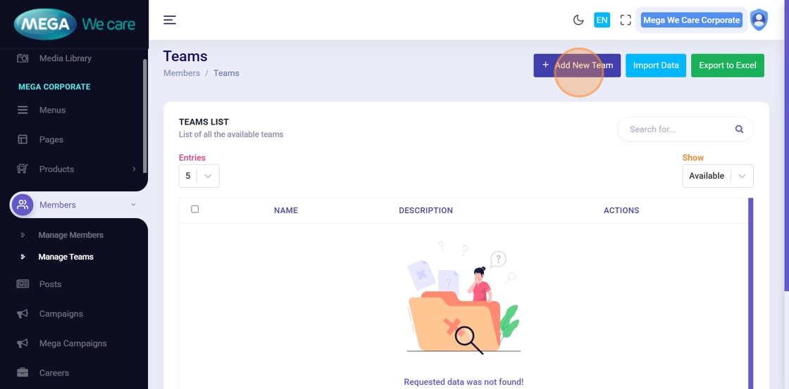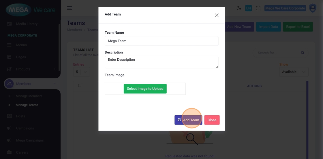 📂 Log in to the Admin Dashboard, open the sidebar, and click Manage Teams.