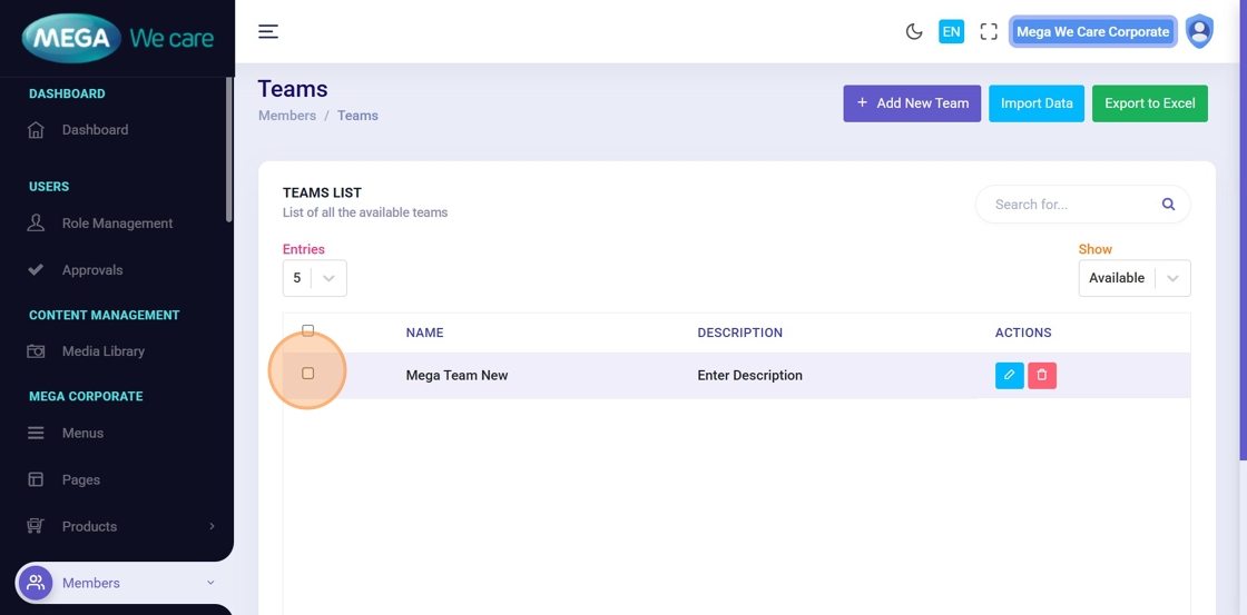 ☑️ Use the checkboxes to select one or more teams, or select all using the header checkbox.