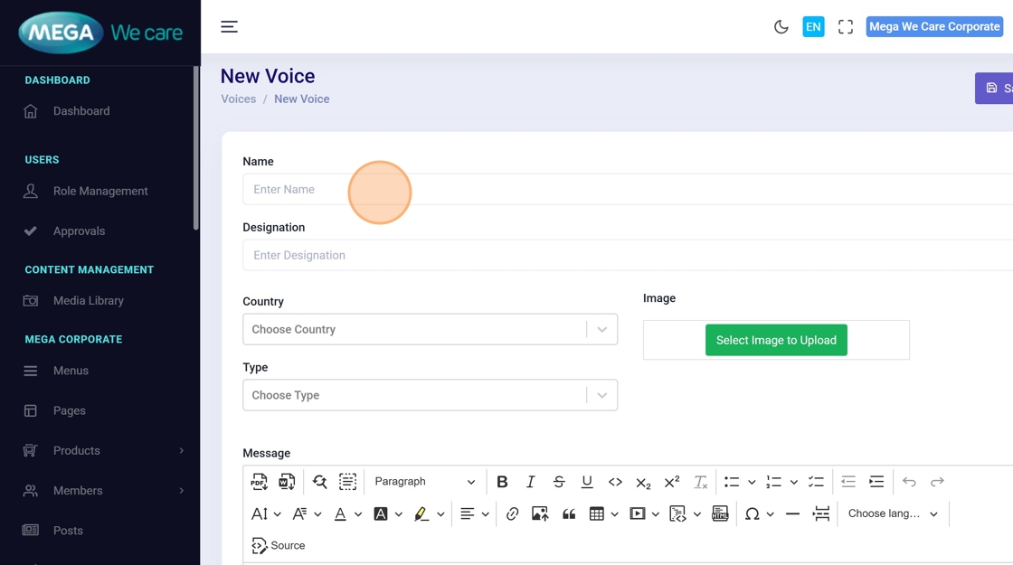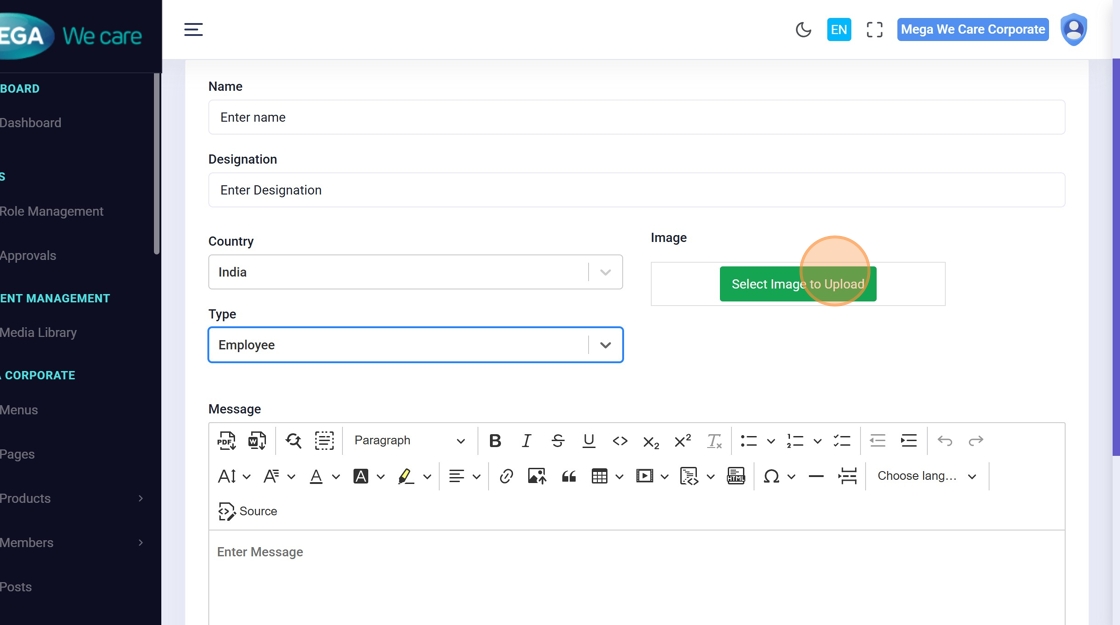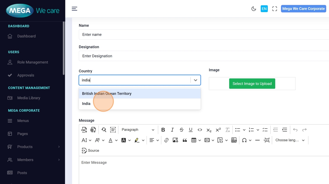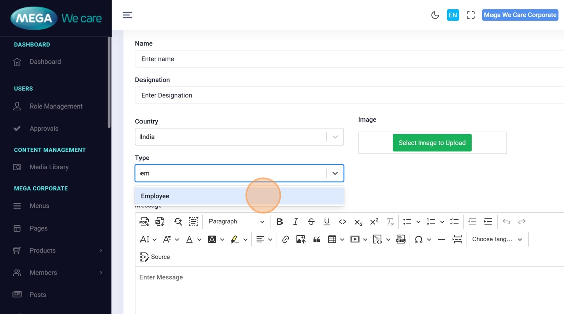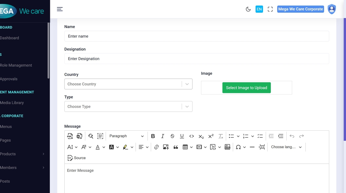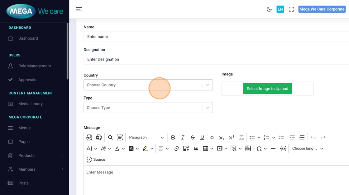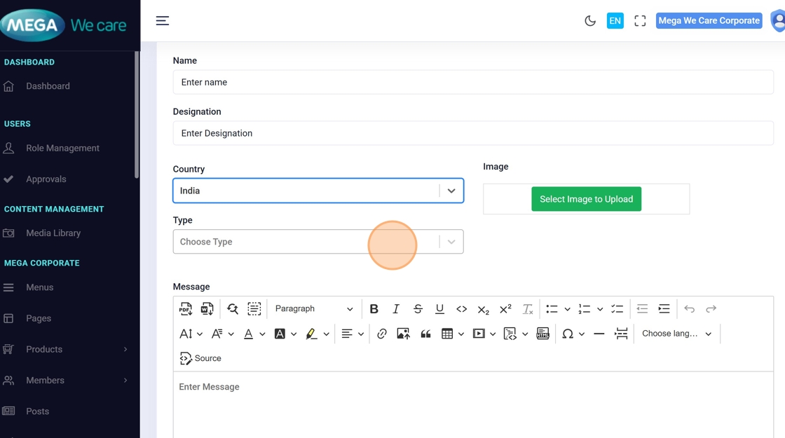 Modify fields like name, designation, country, type, or message directly in the form.