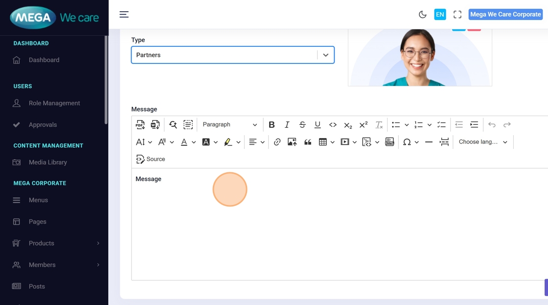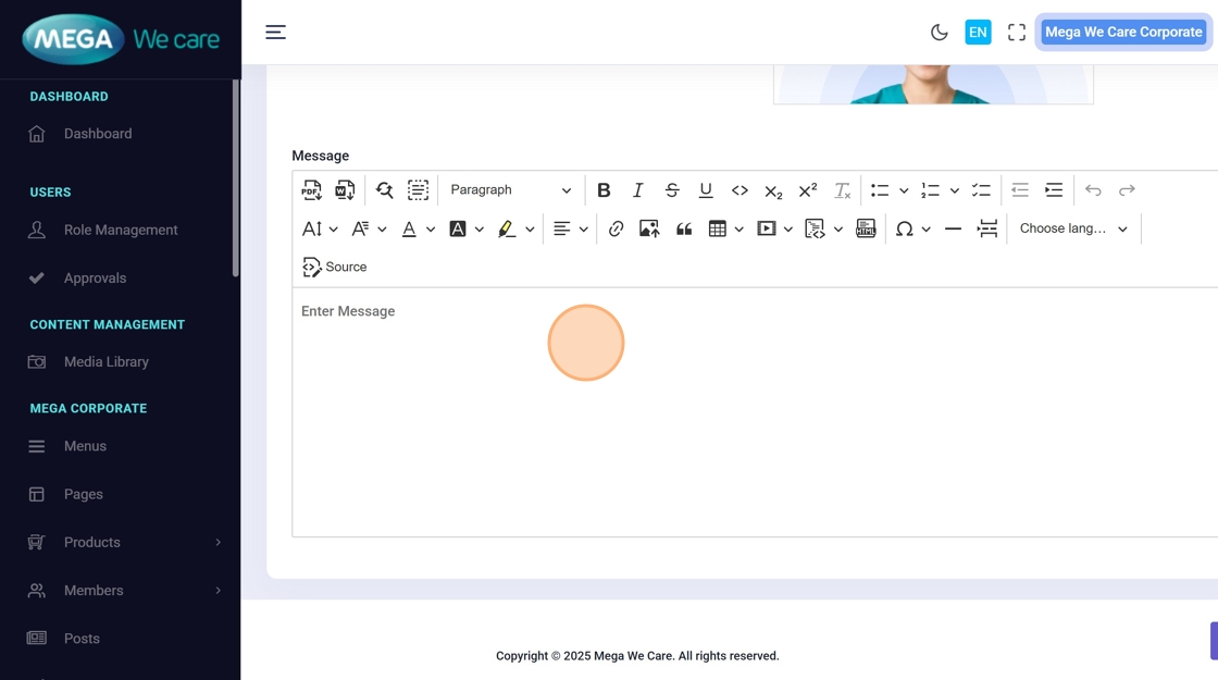 Type the testimonial text in the Message editor.