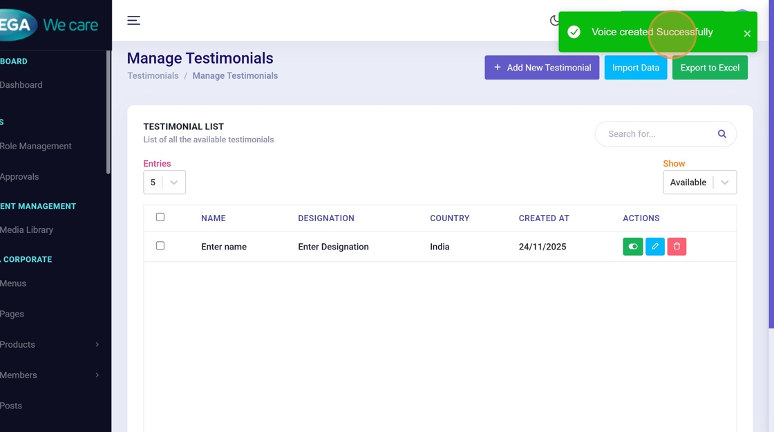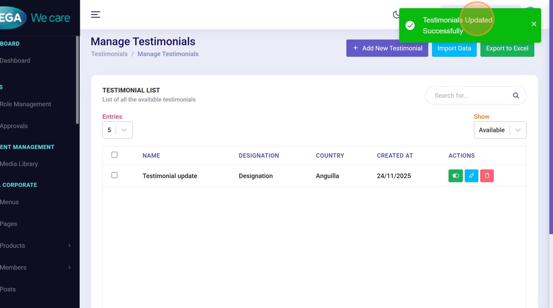 By following this guide, you can easily complete the full add, edit, update, and delete flows with clear steps, images, and confirmation screens, ensuring testimonial management is accurate, safe, and easy to follow.