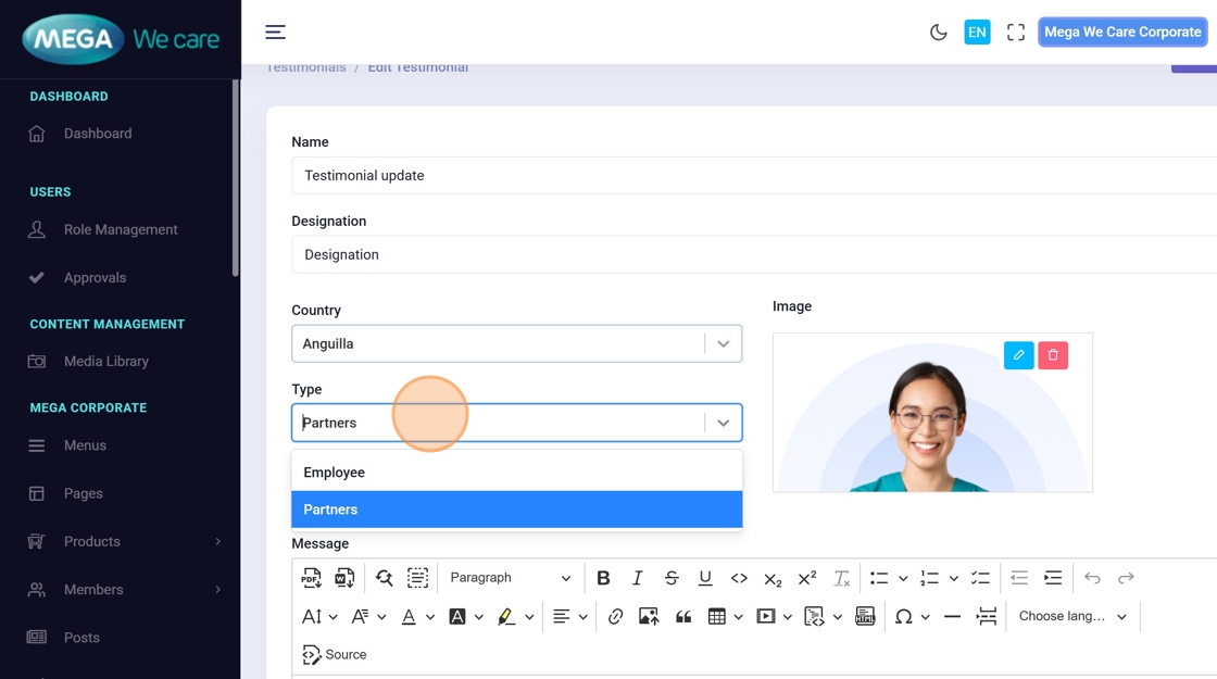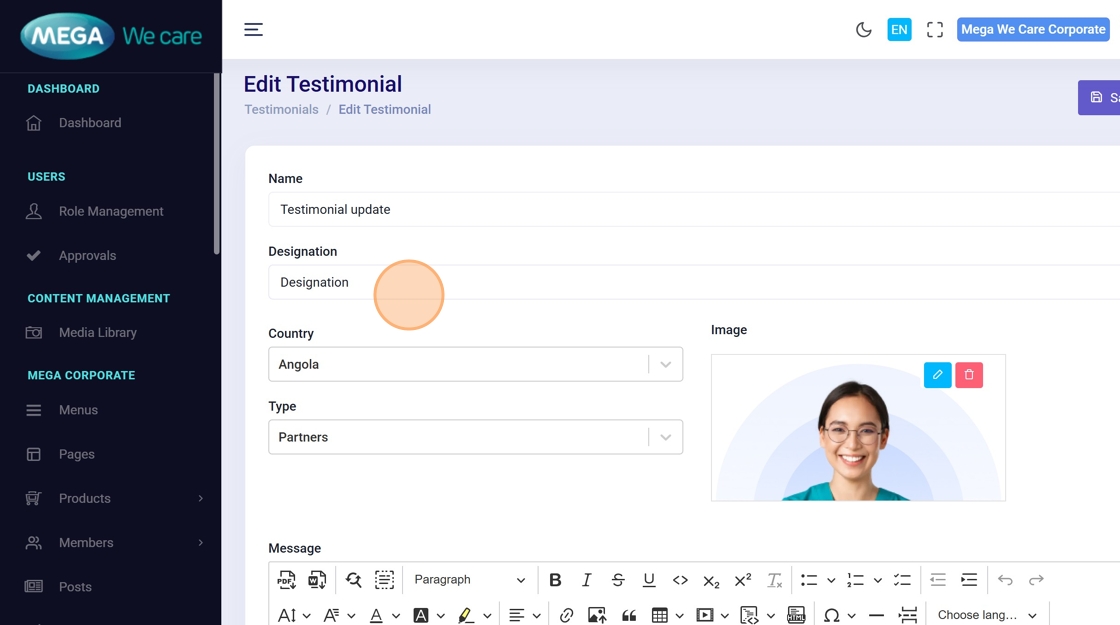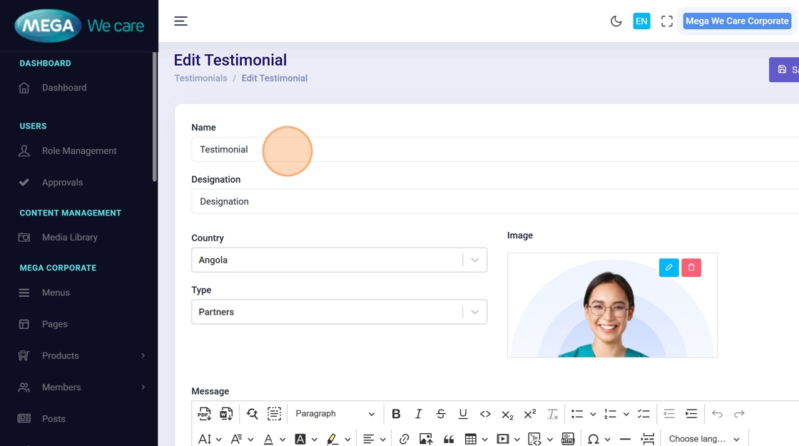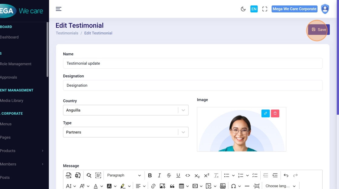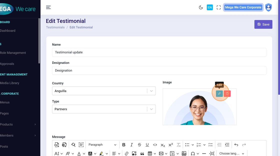 Use these steps to edit any testimonial field or replace the profile image.