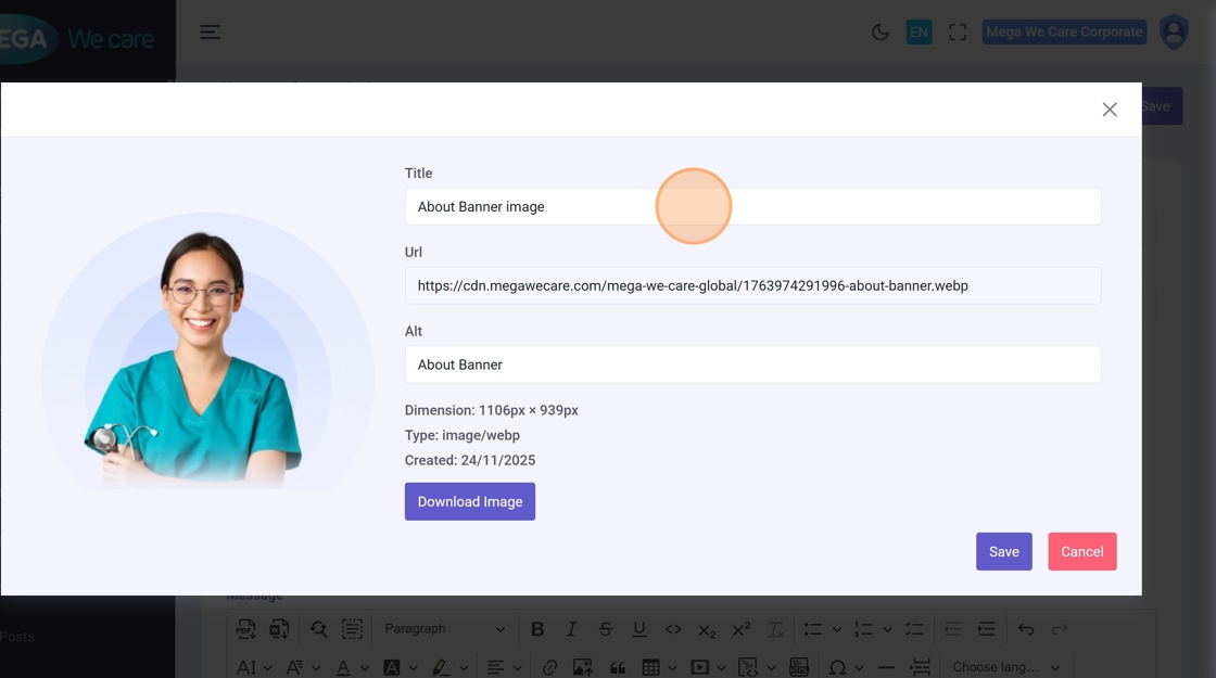 Click the image edit icon to open image settings, change title or URL, then Save.