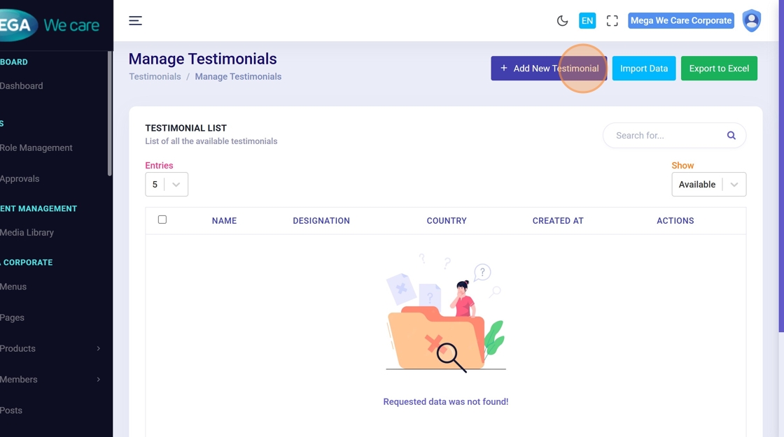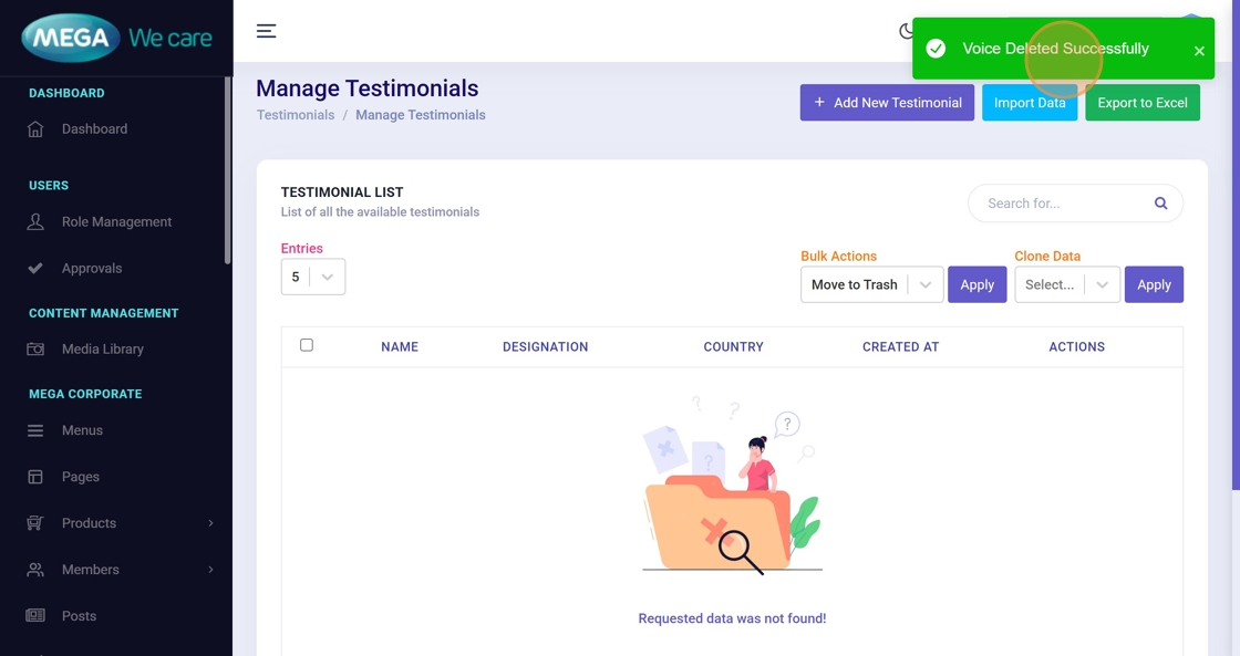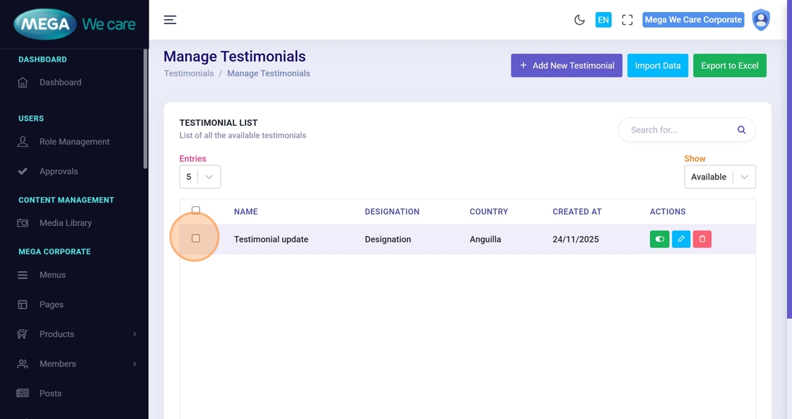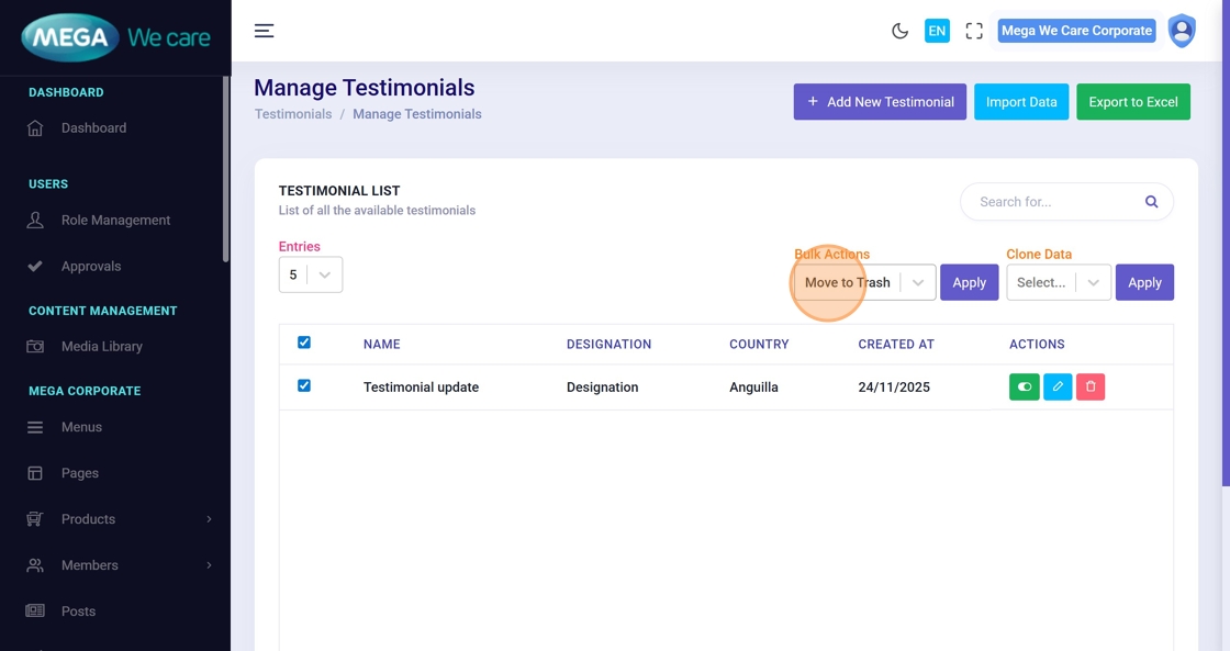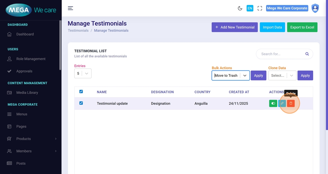 The Testimonials module lets users add, edit, and remove user feedback. Use this guide to manage testimonials: add new voices, update existing entries, upload profile images, and delete testimonials (single or bulk).