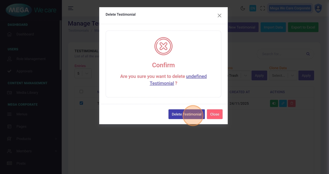 A confirmation popup will appear. Click Delete Testimonial to permanently remove it.