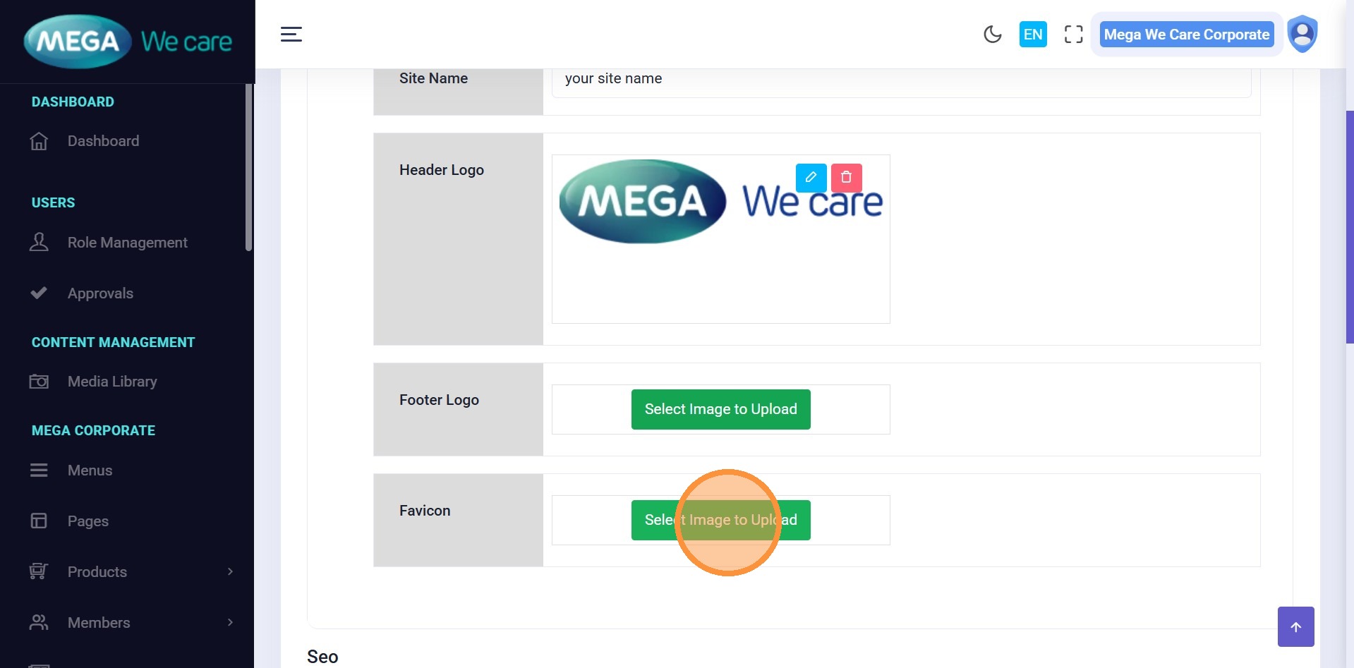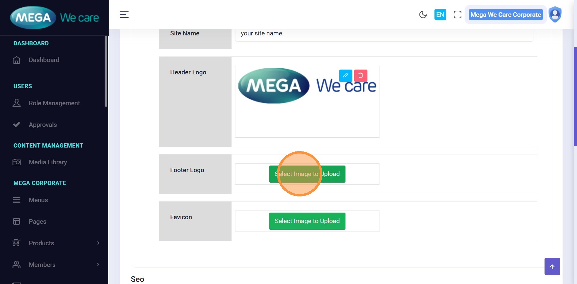 Upload or replace the website’s main logo.