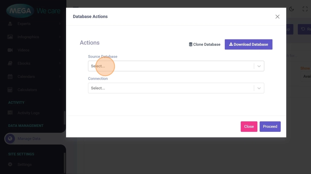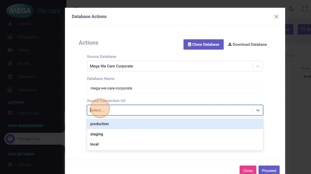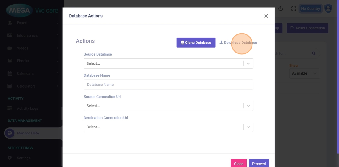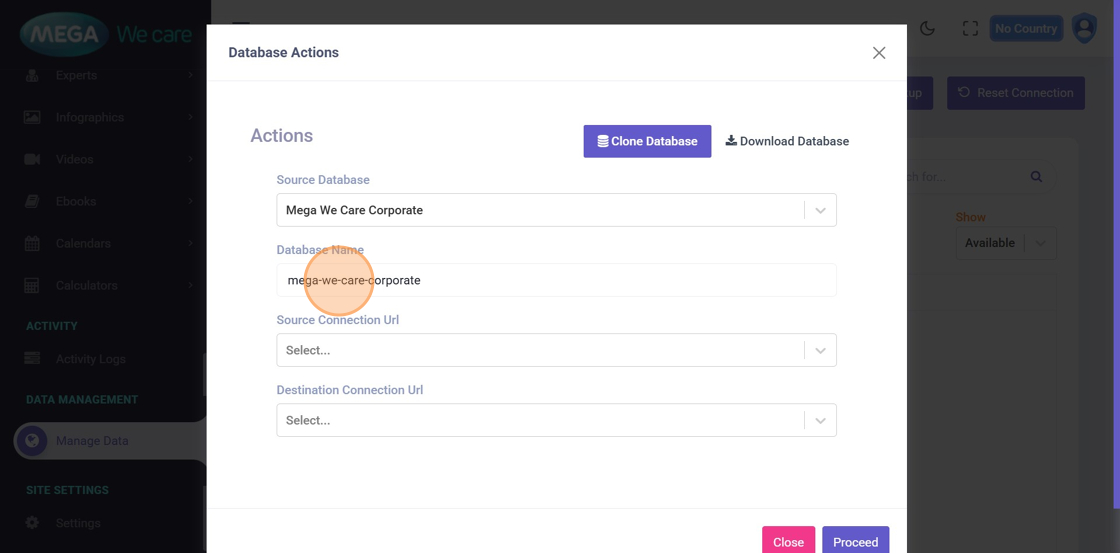 This opens database cloning, download, and backup options.