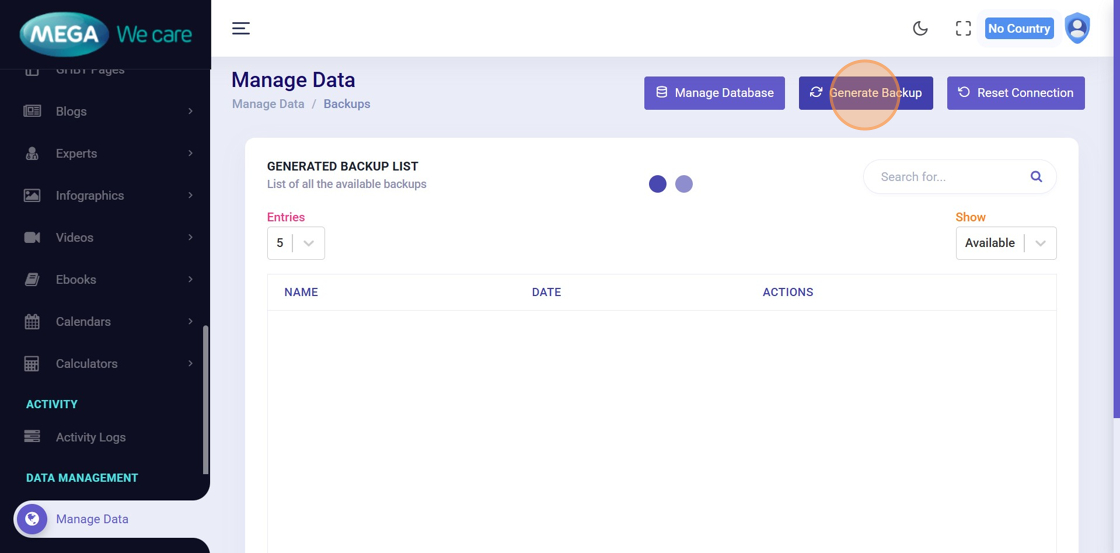 Click Generate Backup to create a backup of the active database.