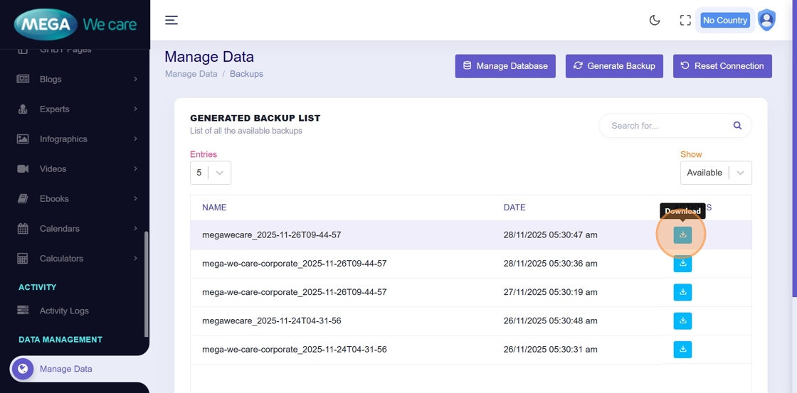 Download the generated backup file in GZIP format by clicking the download icon.