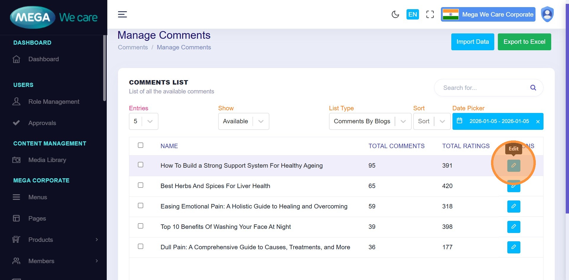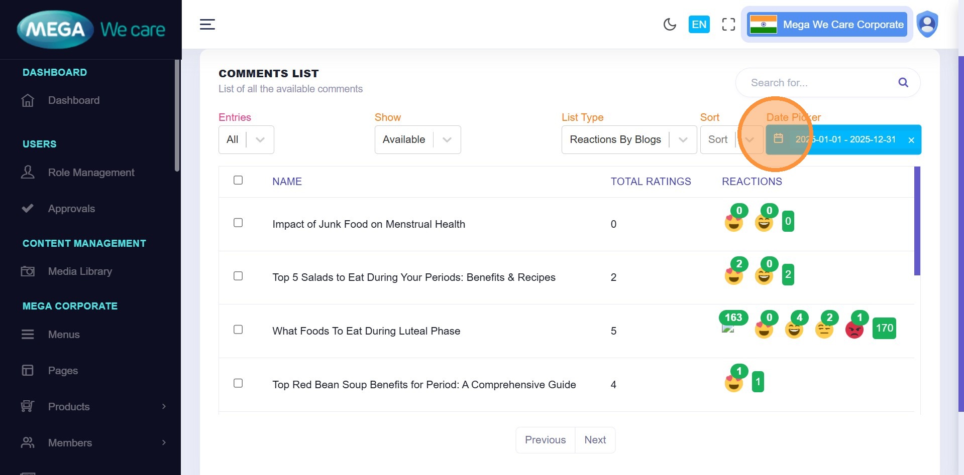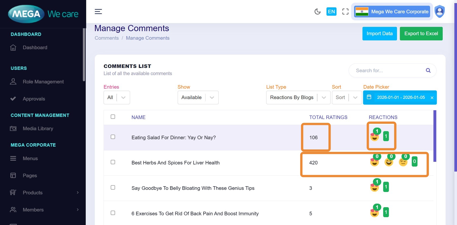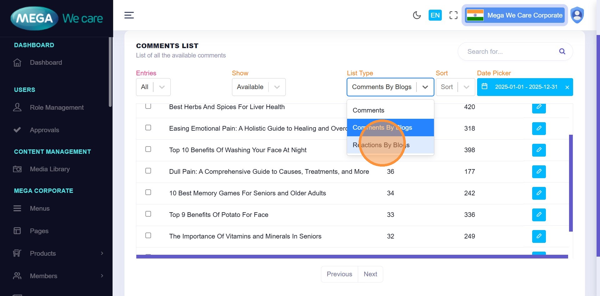 This document explains how to manage blog comments and reactions from the backend dashboard. It covers the complete moderation workflow, including publishing and replying to comments, filtering comments and reactions by date, analyzing engagement, and safely deleting comments using the Trash system. This process helps maintain content quality, user engagement, and moderation control across all blogs.