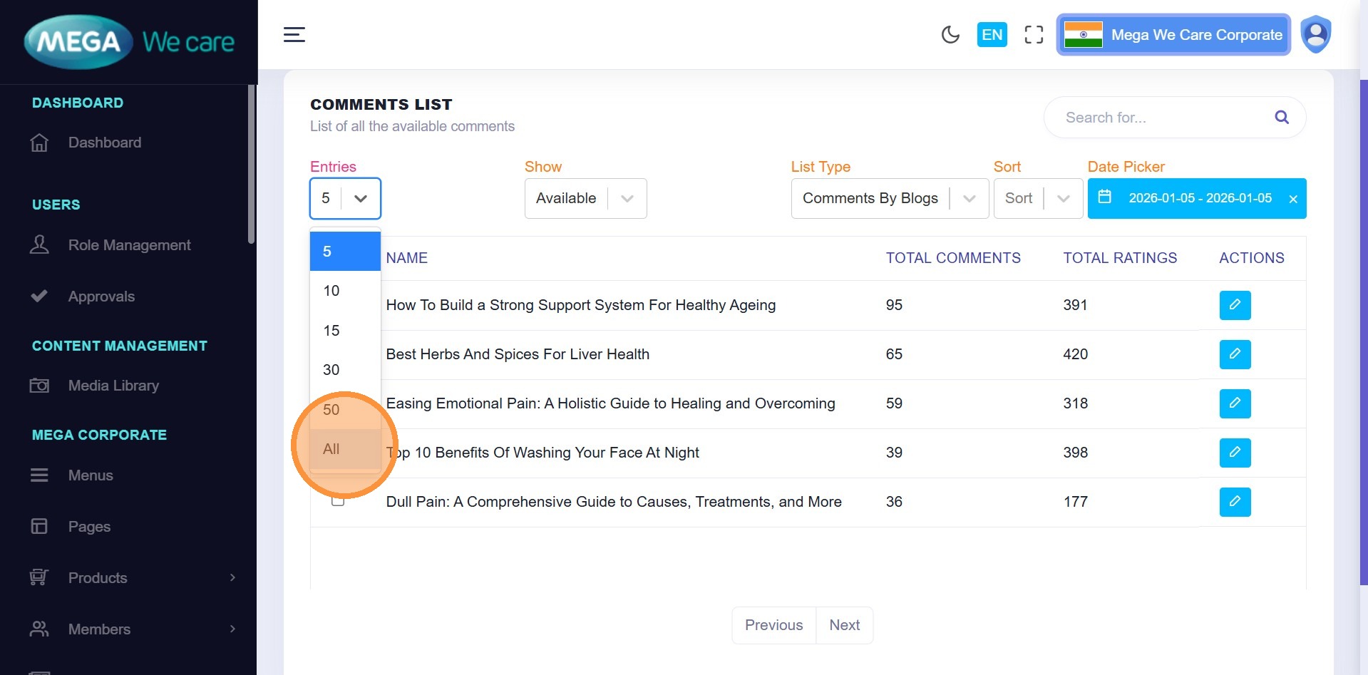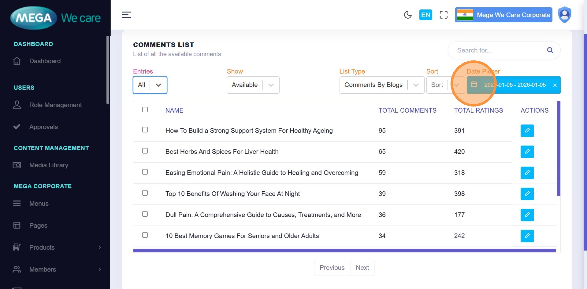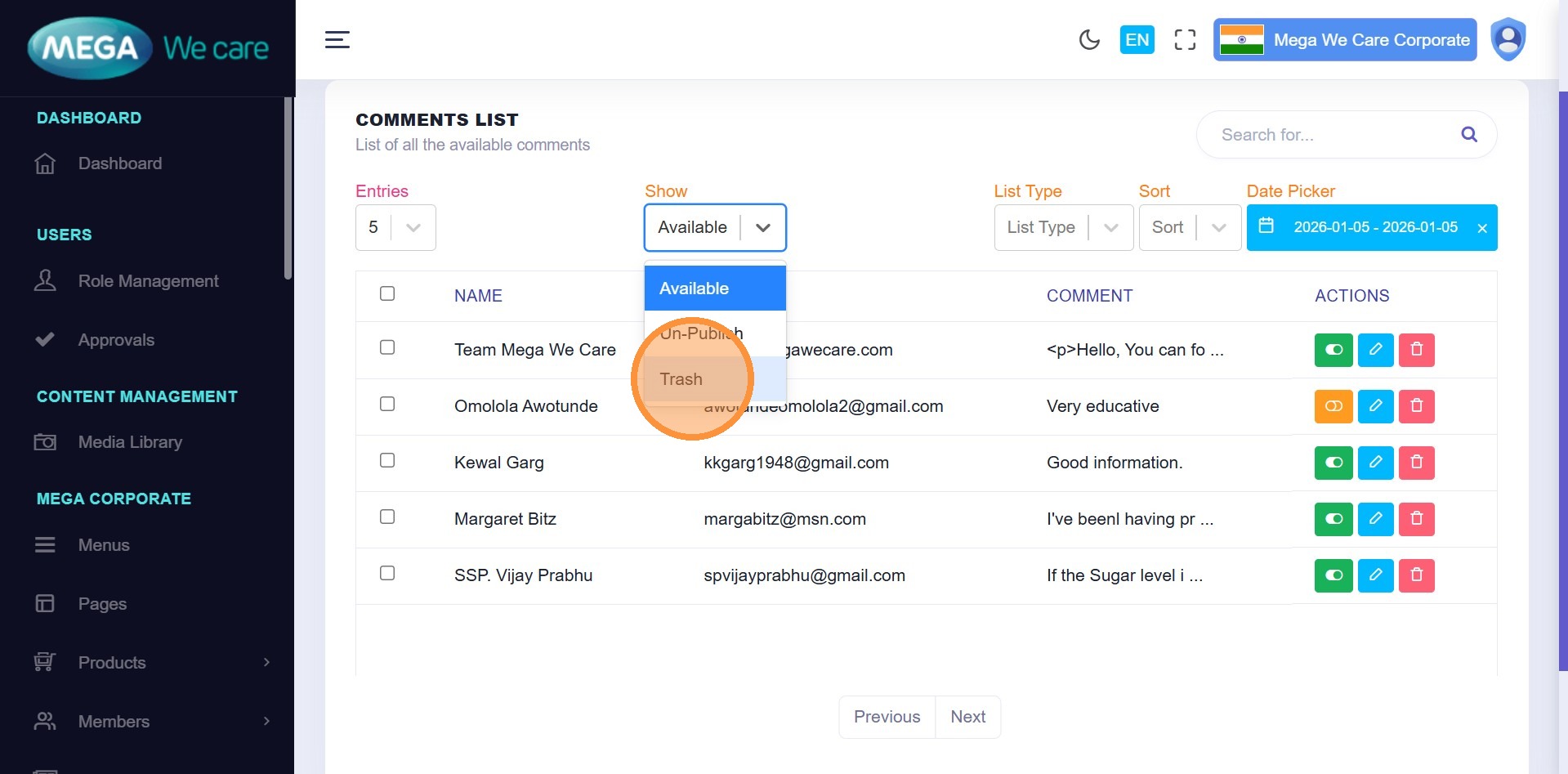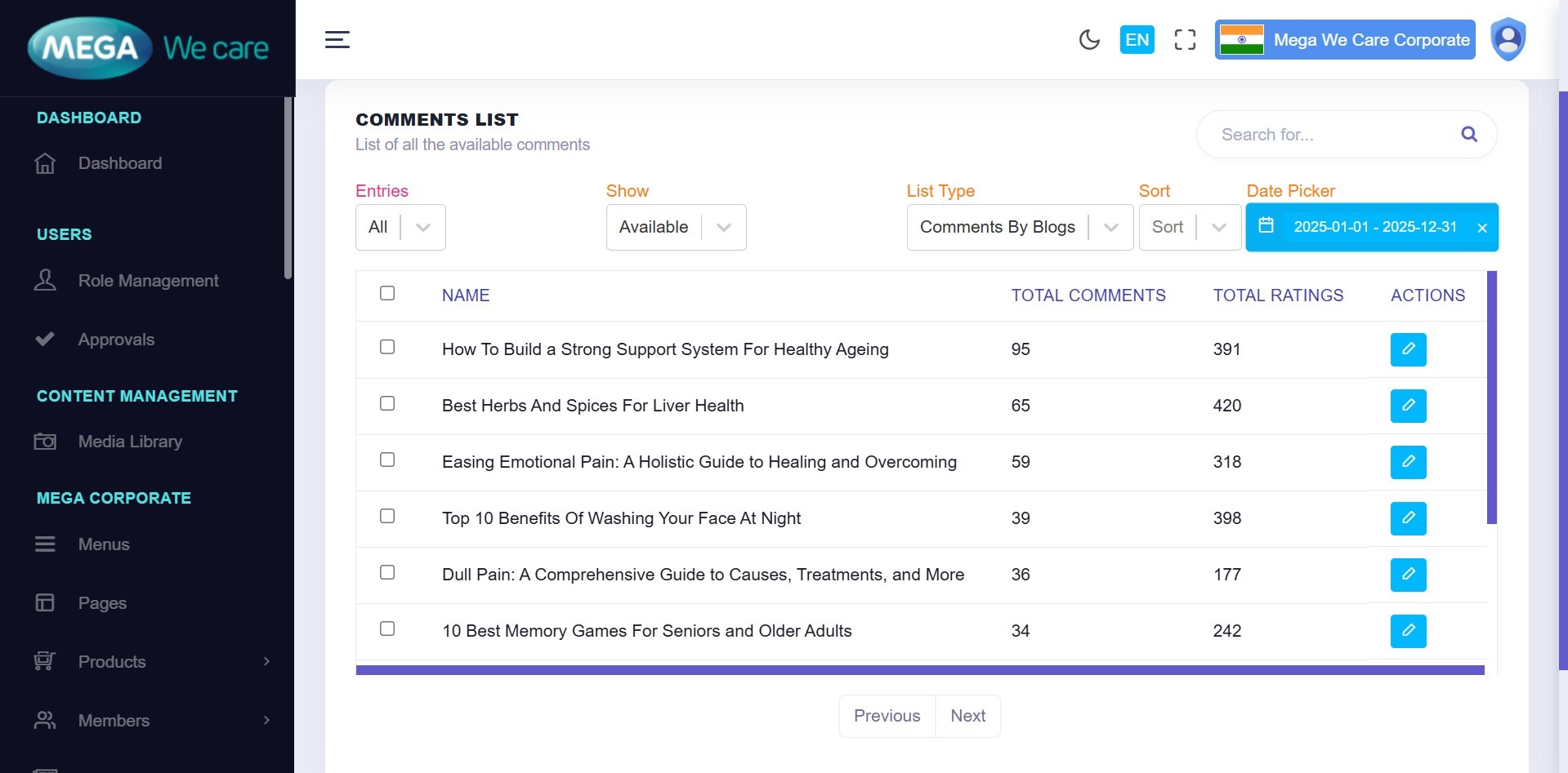 This document explains how to manage blog comments and reactions from the backend dashboard. It covers the complete moderation workflow, including publishing and replying to comments, filtering comments and reactions by date, analyzing engagement, and safely deleting comments using the Trash system. This process helps maintain content quality, user engagement, and moderation control across all blogs.