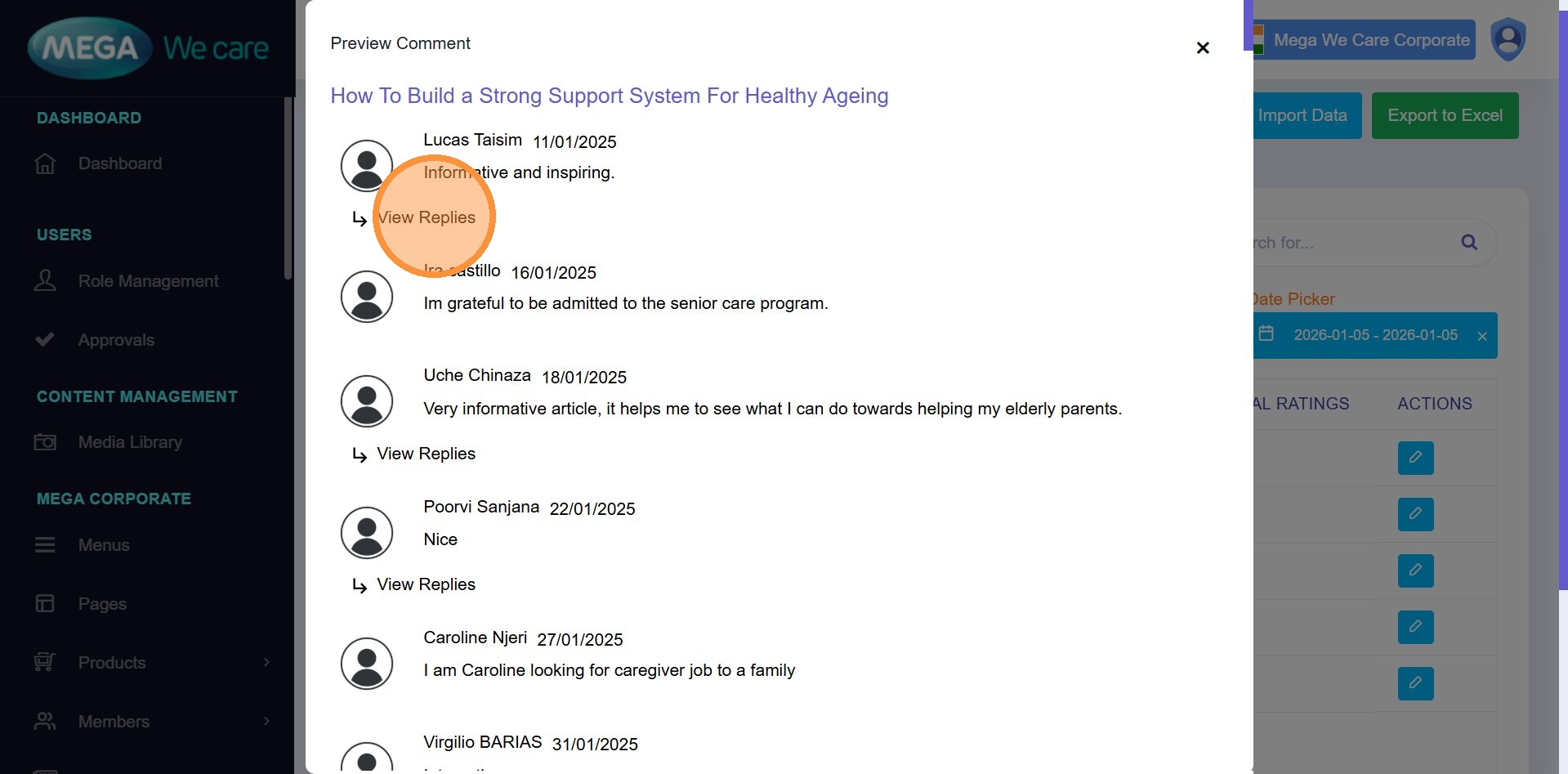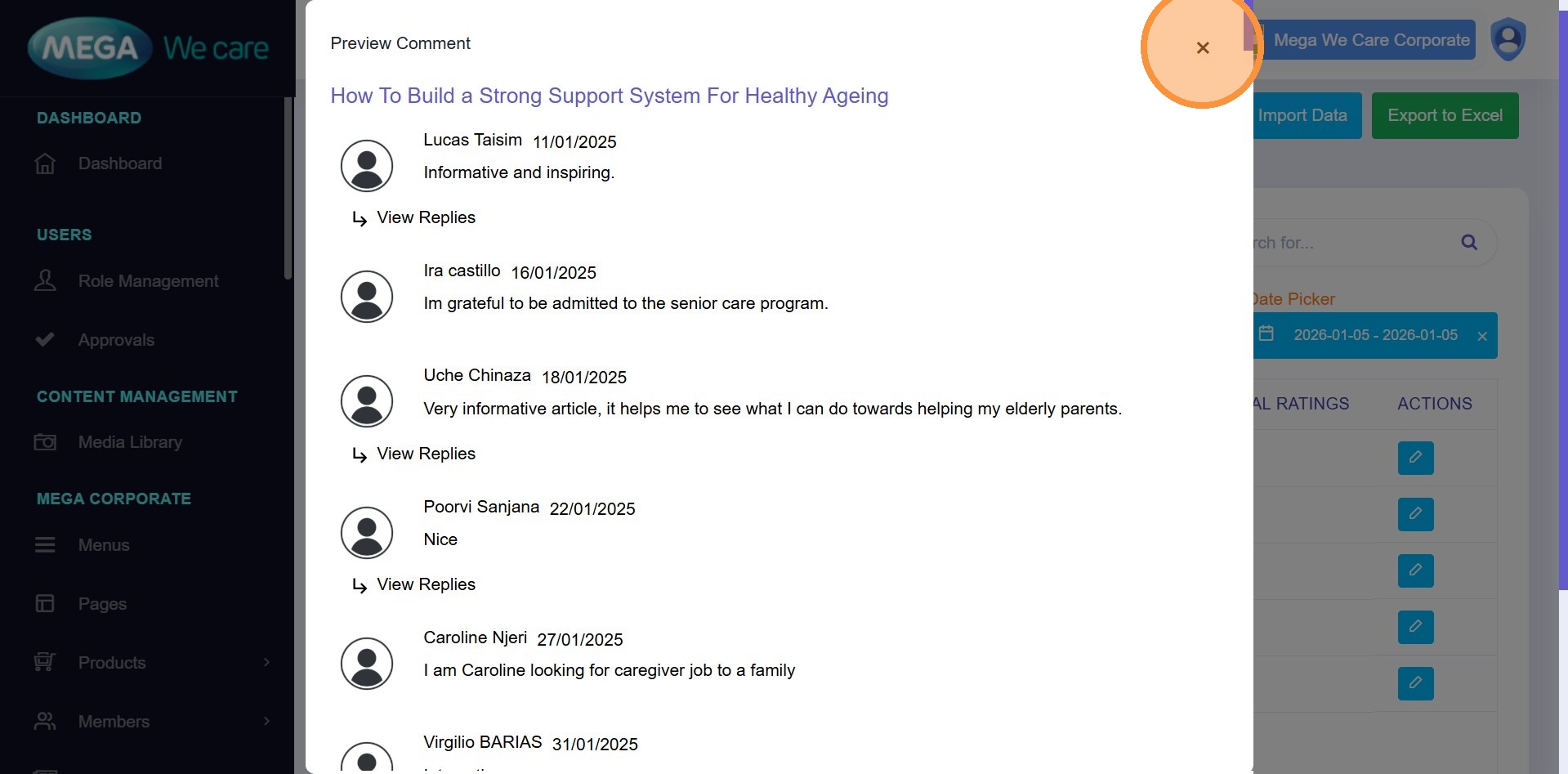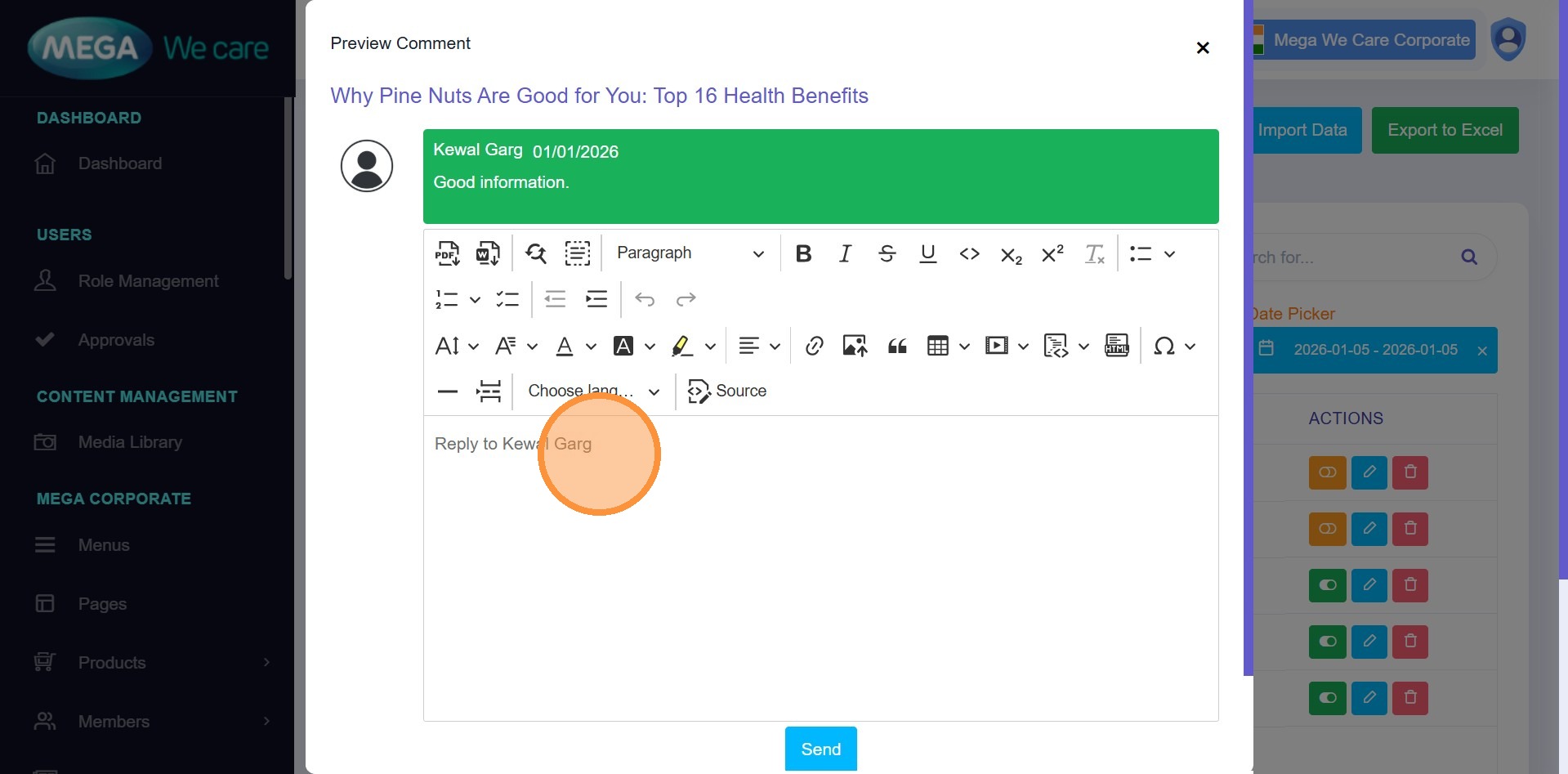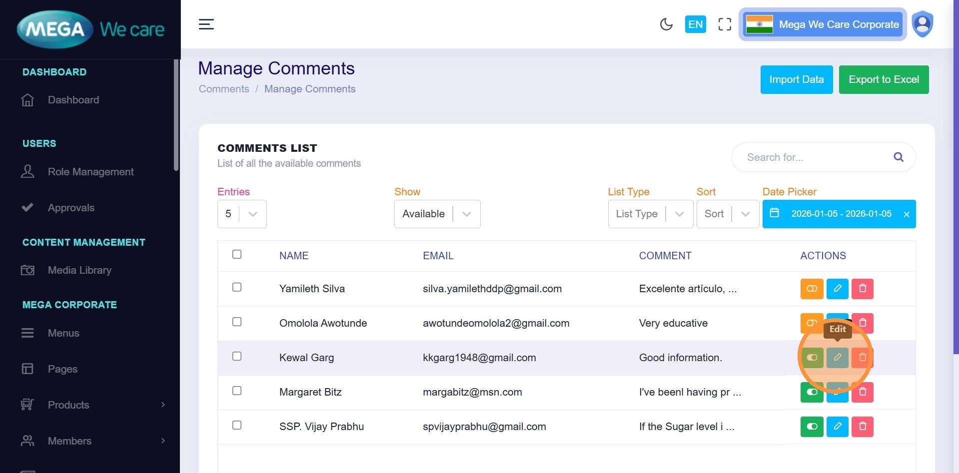 This document explains how to manage blog comments and reactions from the backend dashboard. It covers the complete moderation workflow, including publishing and replying to comments, filtering comments and reactions by date, analyzing engagement, and safely deleting comments using the Trash system. This process helps maintain content quality, user engagement, and moderation control across all blogs.