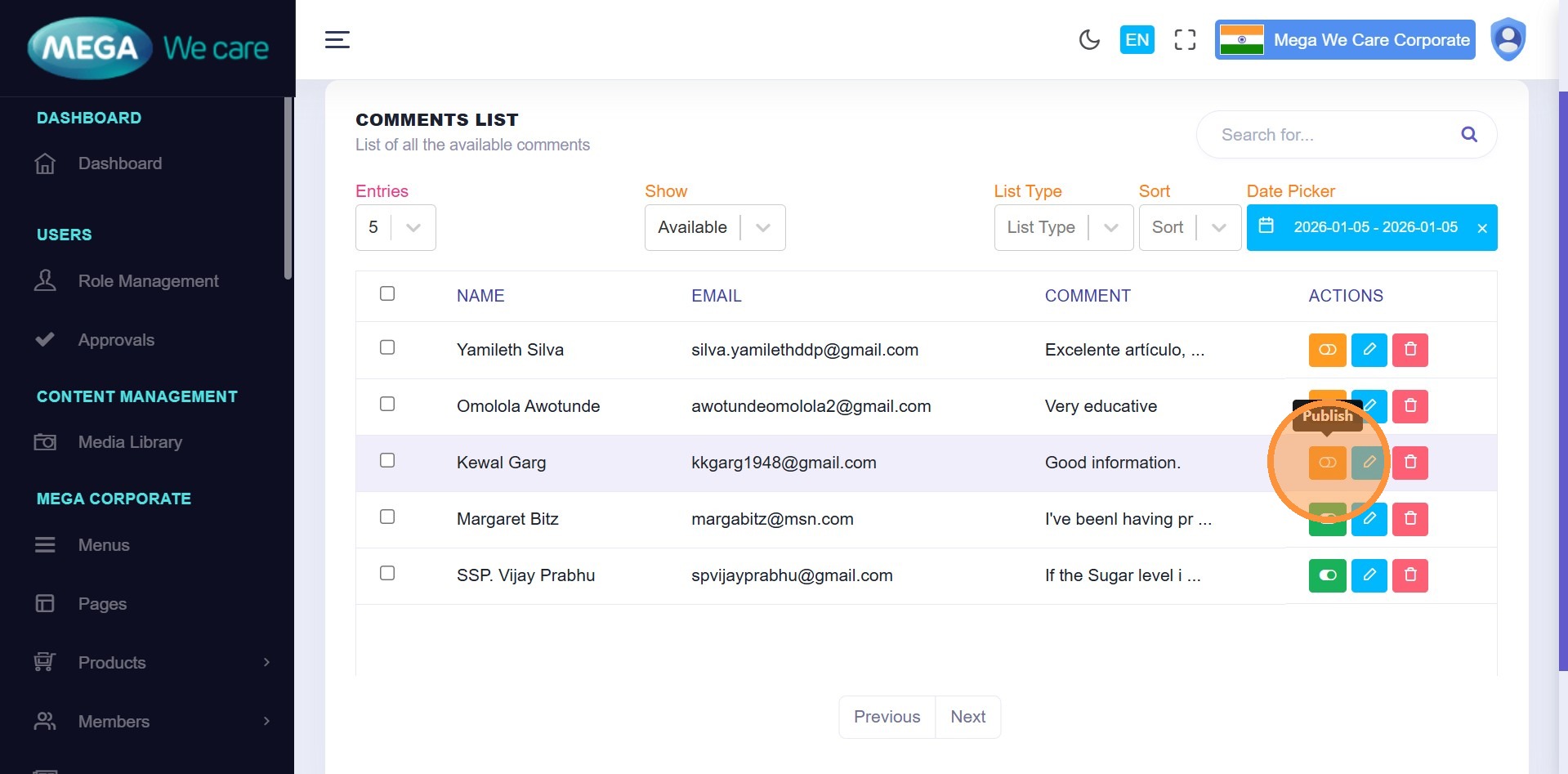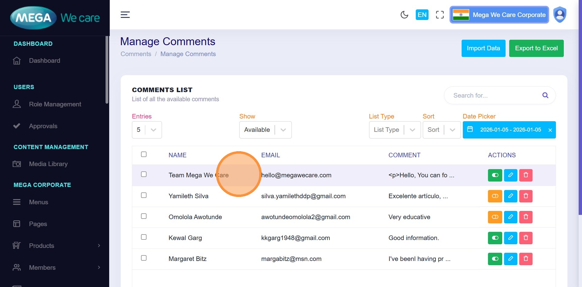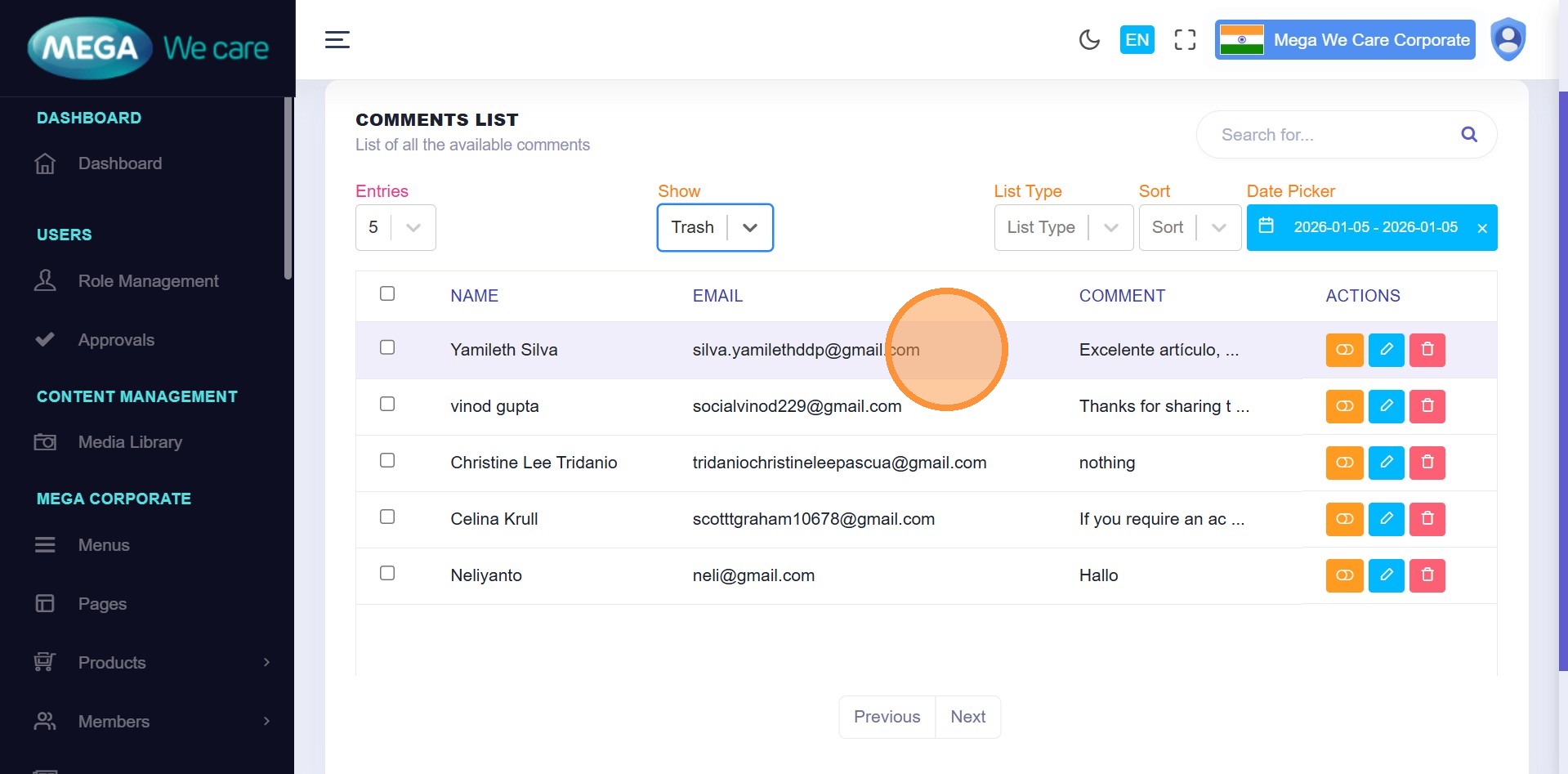 By following this workflow, users can effectively moderate blog comments, publish or hide comments as needed, analyze reactions and engagement by date, safely delete or restore comments, and maintain a healthy and trustworthy comment system across all blogs.